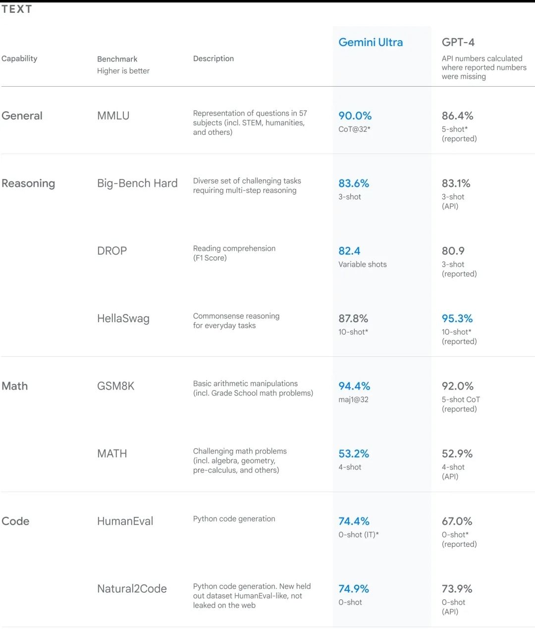 Google最新Gemini模型的文本能力评估似乎有些小花招,很多评估条件都是不太一样的,如果真的如宣传的那样全面超过GPT4没必要玩这些trick。