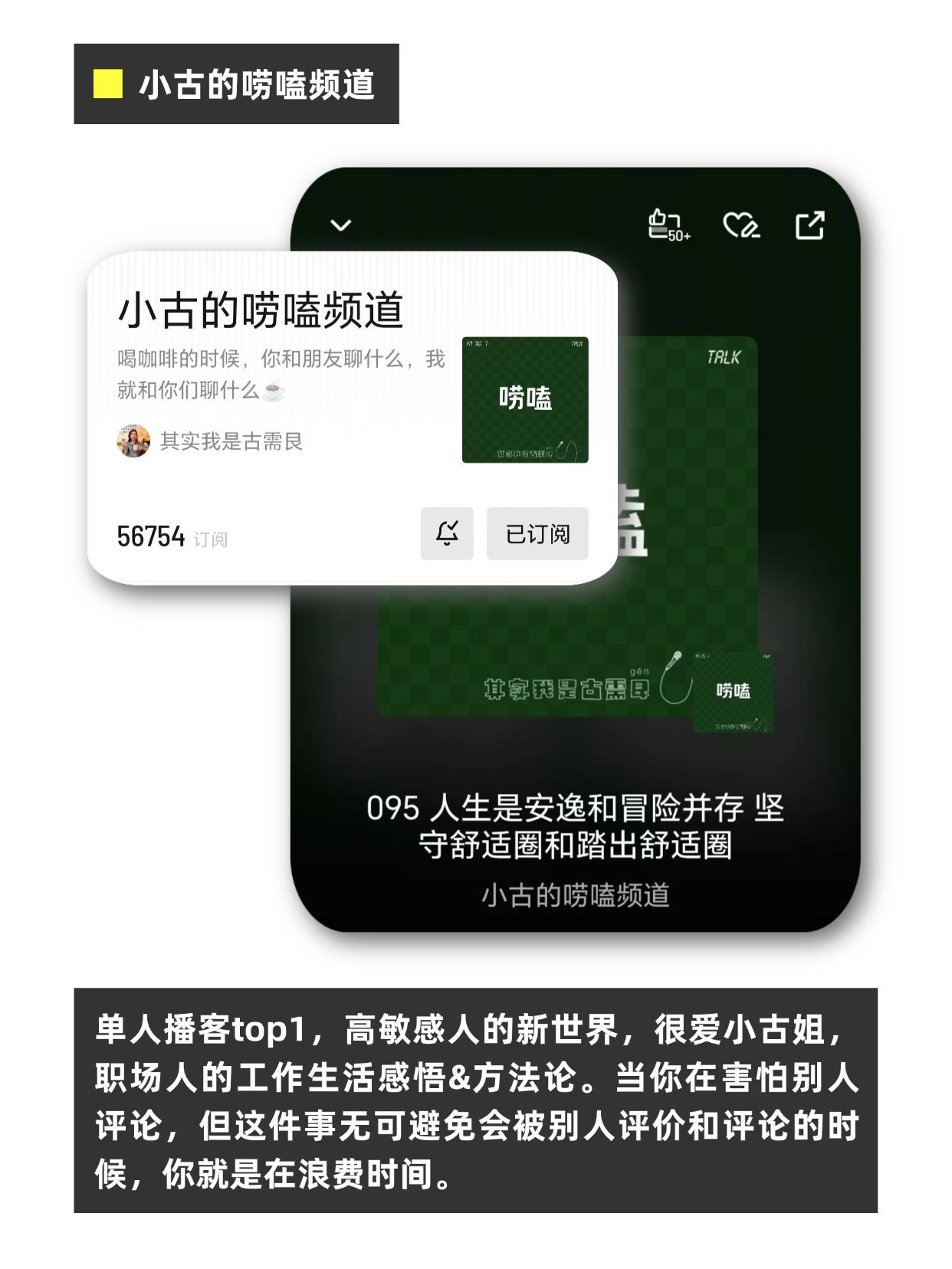 单人播客top1,高敏感人的新世界,很爱小古姐,职场人的工作生活感悟&方法论。当你在害怕别人评论,但这件事无可避免会被别人评价和评论的时候,你就是在浪费时间。