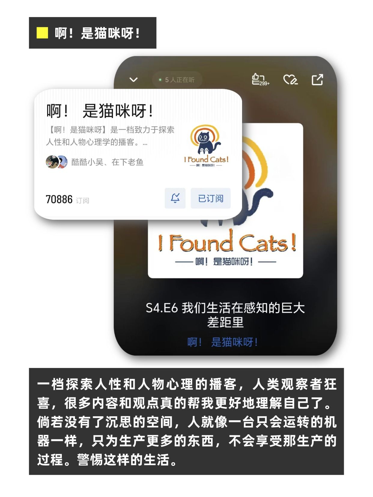 一档探索人性和人物心理的播客,人类观察者狂喜,很多内容和观点真的帮我更好地理解自己了。倘若没有了沉思的空间,人就像一台只会运转的机器一样,只为生产更多的东西,不会享受那生产的过程。警惕这样的生活。