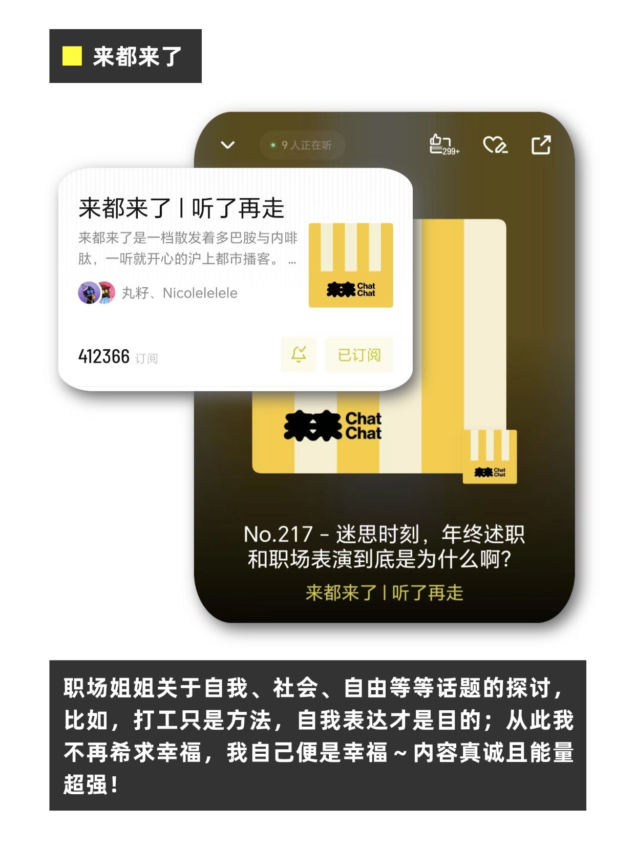 不过播客也只是内容的另一种表现形式,和书籍影视剧分享一样,喜好程度都偏私人,选择适合自己的播客度过充实快乐的时间就好啦。