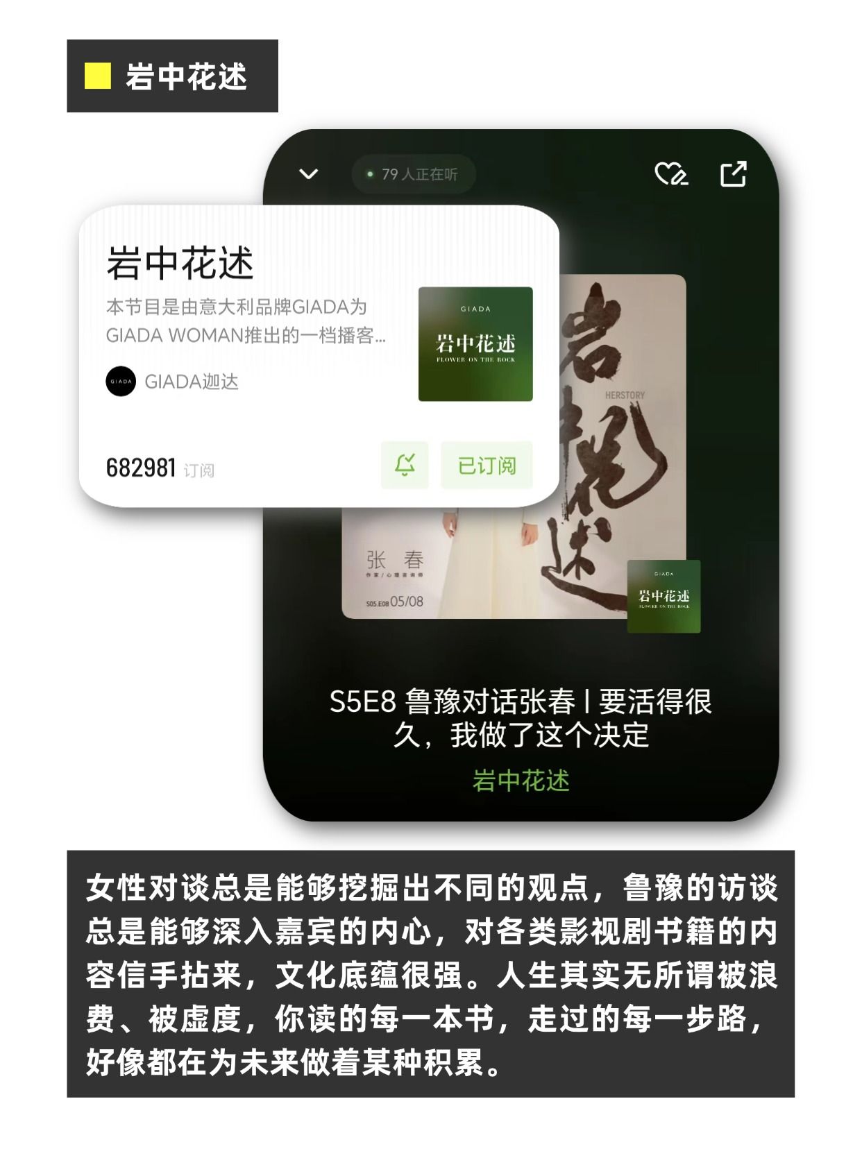 女性对谈总是能够挖掘出不同的观点,鲁豫的访谈总是能够深入嘉宾的内心,对各类影视剧书籍的内容信手拈来,文化底蕴很强。人生其实无所谓被浪费、被虚度,你读的每一本书,走过的每一步路,好像都在为未来做着某种积累。