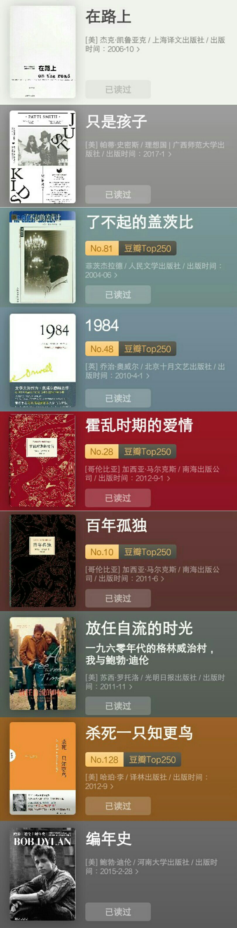 读书(不多):鲍勃·迪伦、马尔克斯、杰克·凯鲁亚克、哈珀·李、村上 春树、菲茨杰拉德、鲁迅、《放任自流的时光》、《Bob Dylan诗集》、《百年孤独》、《霍乱时期的爱情》、《在路上》、《杀死一只知更鸟》、《挪威的森林》、《了不起的盖茨比》……