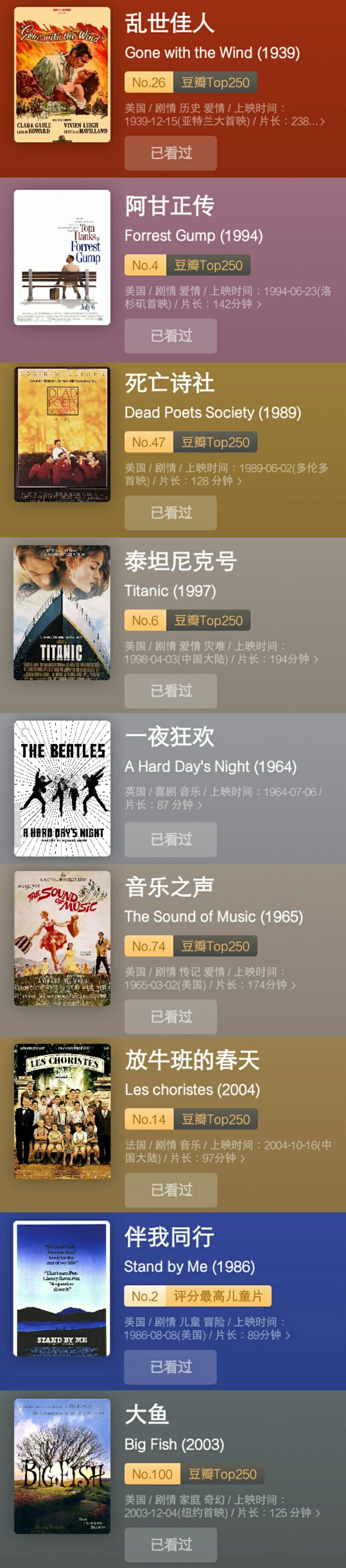 电影:费雯·丽、希区柯克。《乱世佳人》、《魂断蓝桥》、《阿甘正传》、《音乐之声》、《一夜狂欢》、《死亡诗社》、《大鱼》、《落水狗》、《泰坦尼克号》、《千年女优》……