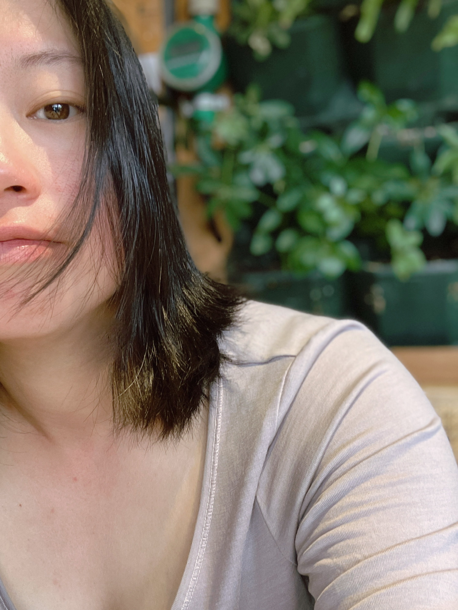 今天拍照才发现脸颊晒得好红,这两天总忘了涂防晒…头发挡一下吧🥲