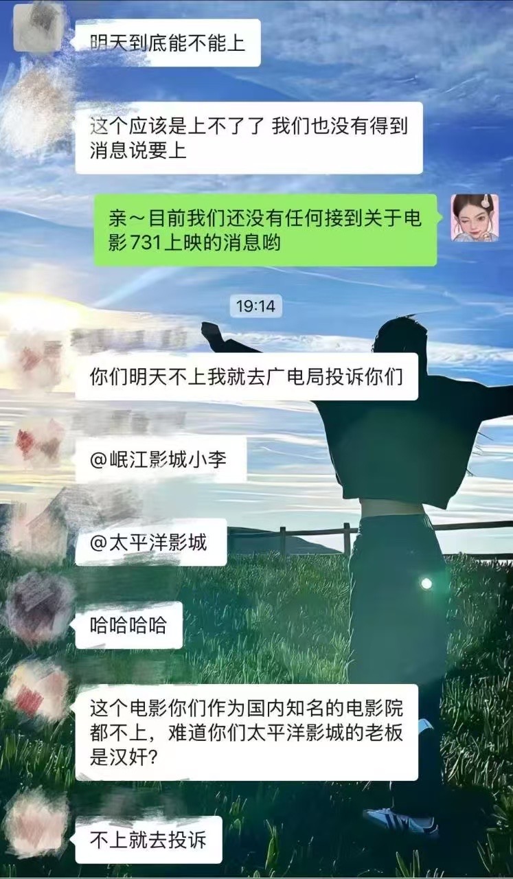😂到时候上映我卖731元一张,不买票的也都是汉奸。最近上班接到的电话也都是问这个的,说实话业内人来看,这个片子就是质量太差才上不了的,没别的原因