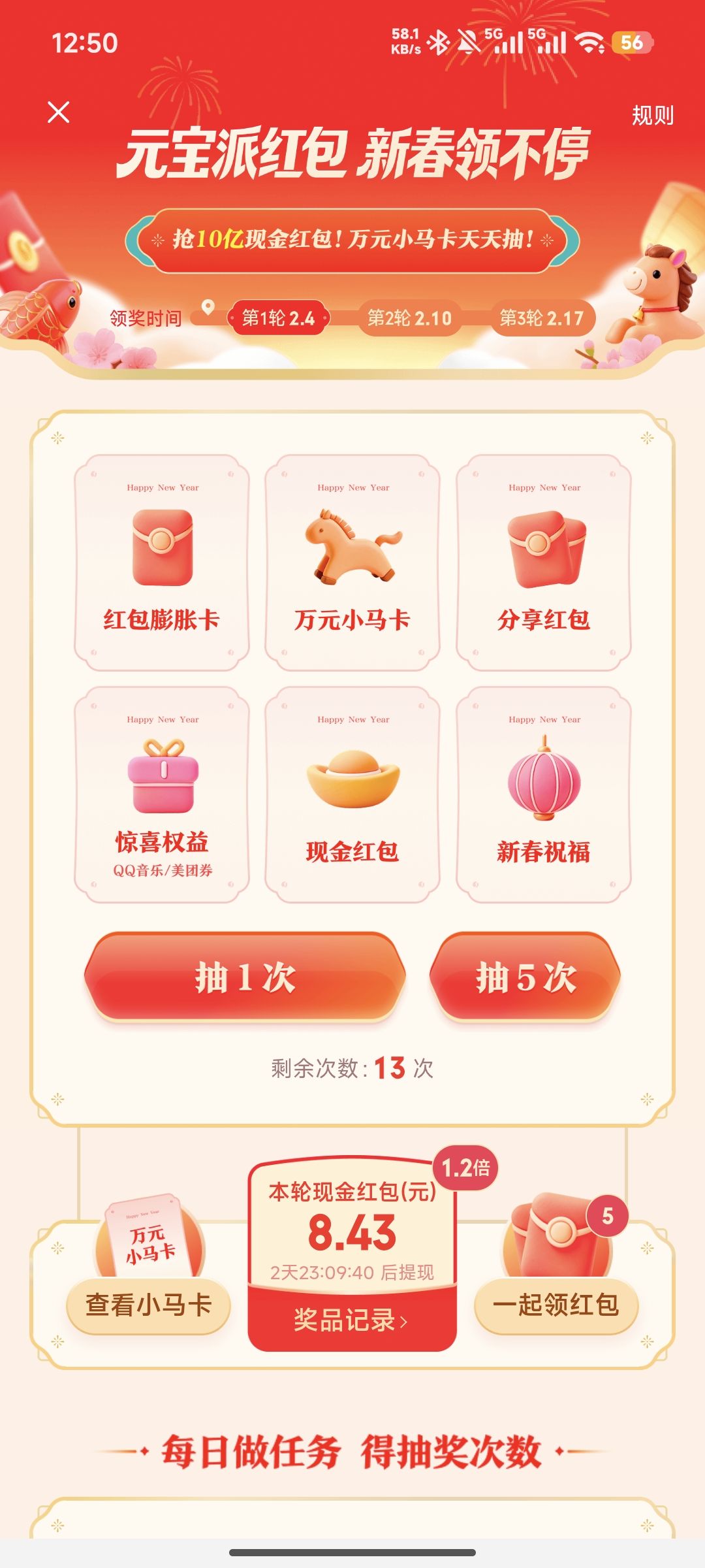 抽奖得现金红包概率30%,但每天最多10个,且金额随机,不确定性较强