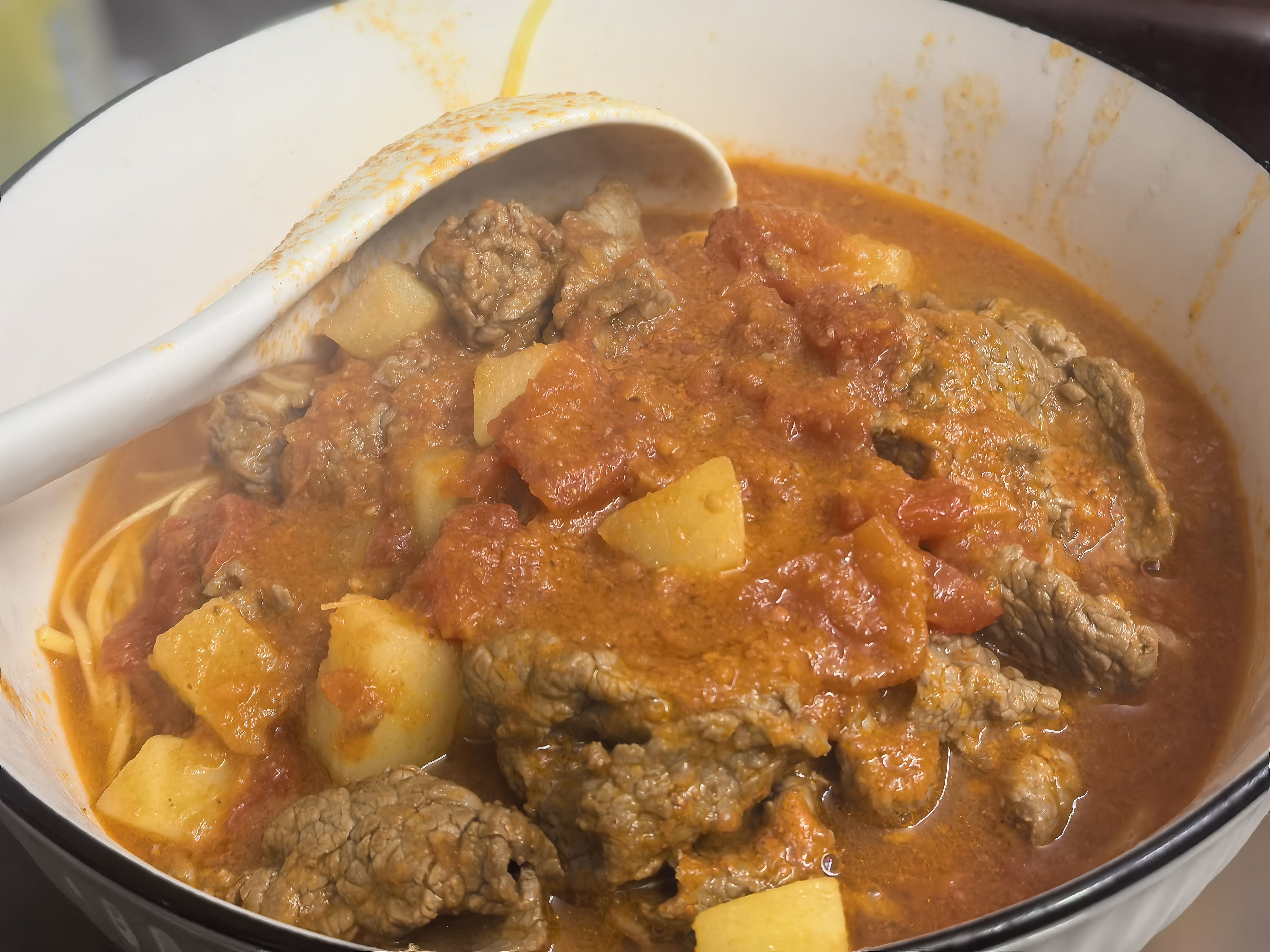 牛腩版本,我的想法是,切小块,加姜少过水煮熟,沥干,煎炒微焦。加卤料配方,用压力锅炖。牛腩才足够入味软烂。浇汤先下牛腩再加番茄汤就可以。