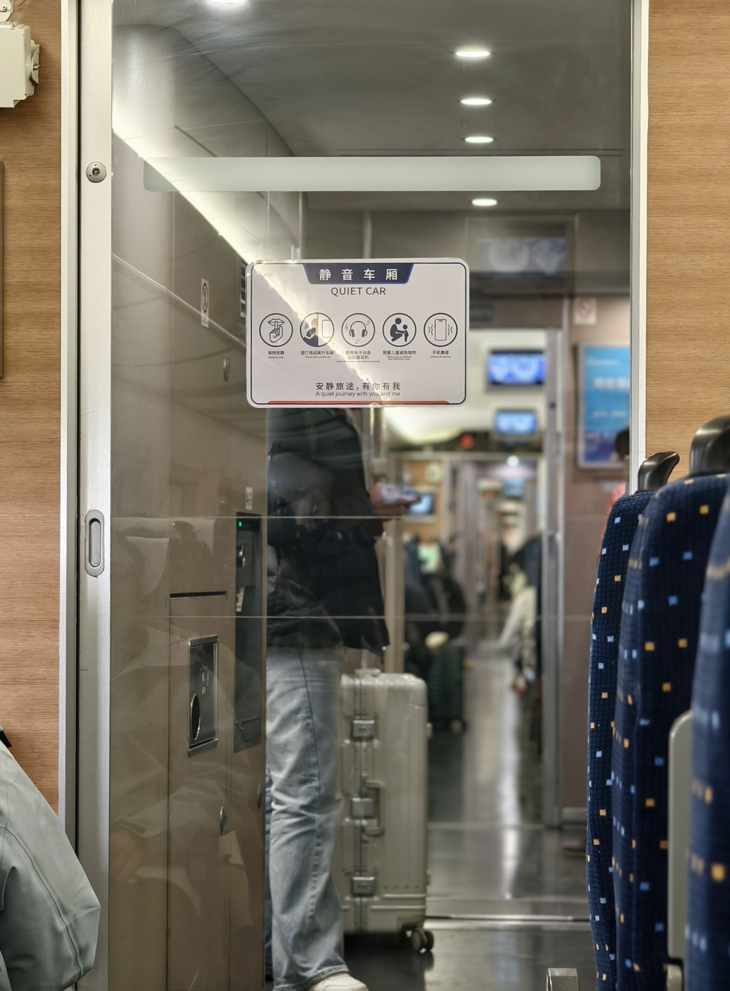 第一次坐静音车厢,以为有什么黑科技,并没有,只是加了两扇玻璃门,以及有人大声讲话、接电话,乘务员就过来提醒他小声点,出去接[破涕为笑]
