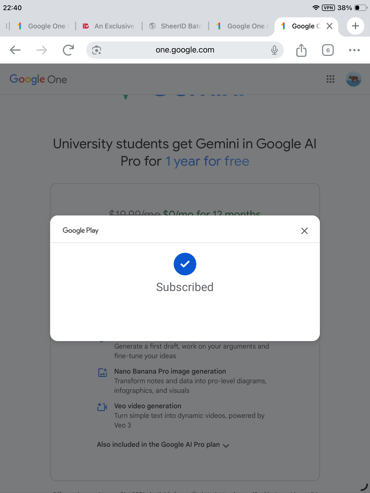 之前电脑上没有成功过的,注册谷歌新账号都很难。只有老账号有邀请,成功开通了一年。只是两个都能用Gemini,时间有点重合了。一般来说每天一百个图片生成请求也够了,这个小号也就是备用,测试下注册难度。