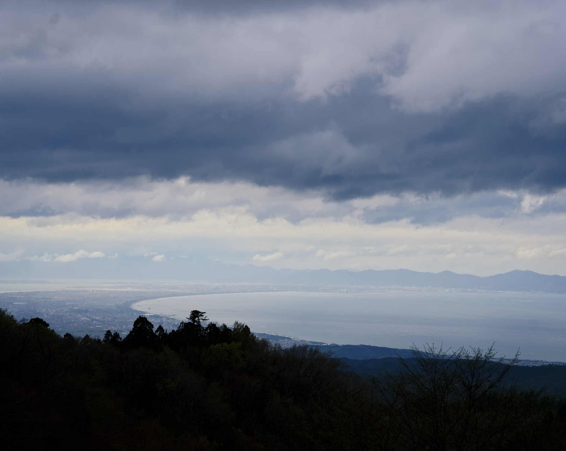 没想到开车上山的路上还有神社都还有积雪。背靠着神社,就能够直接看到琴浦的海湾。