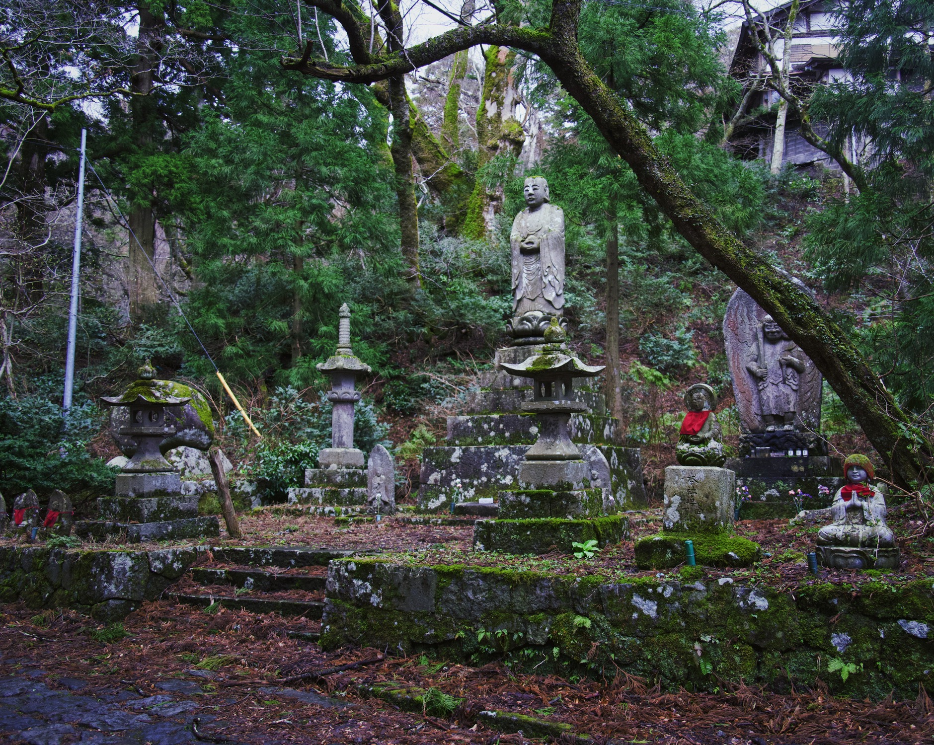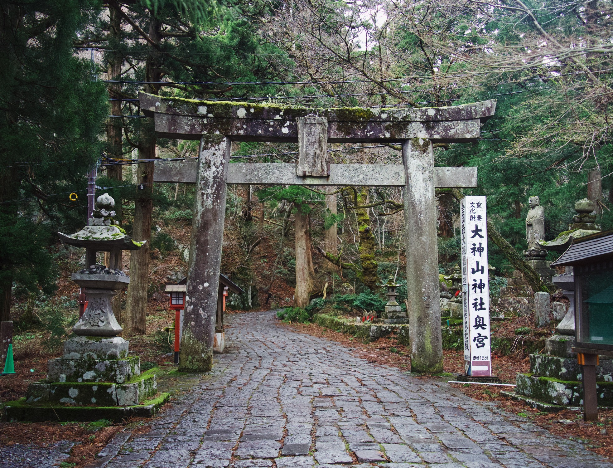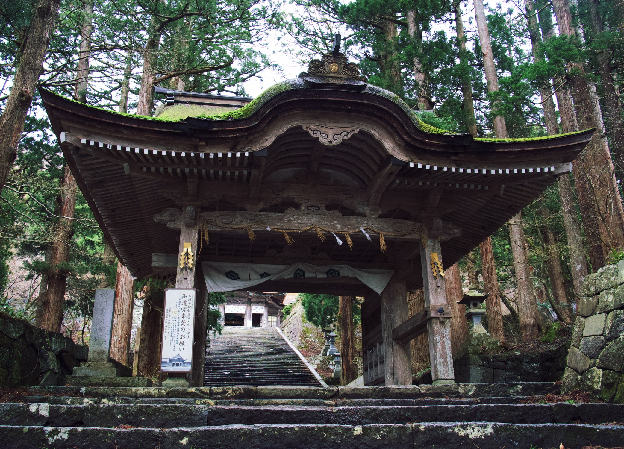 下了一晚的雨,还是阴天。开出去没多久,视线里就出现一座雪山,也就是大神山神社所在的大山。登山步道的起始点就有一个两层的MontBell,现在是淡季几乎没人。前往和离开神社的路上只见到打扫的工作人员。