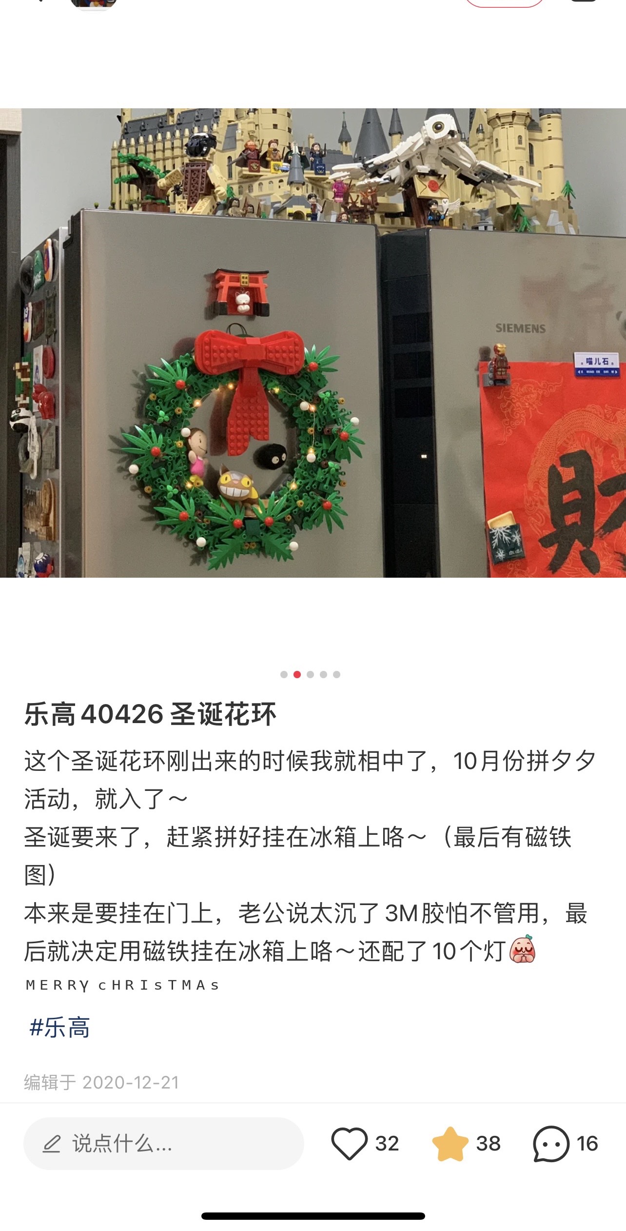乐高74188:这个花环挂着确实很容易变形🫠学了这个po主用带磁铁的乐高砖整到冰箱上,效果很可以👍