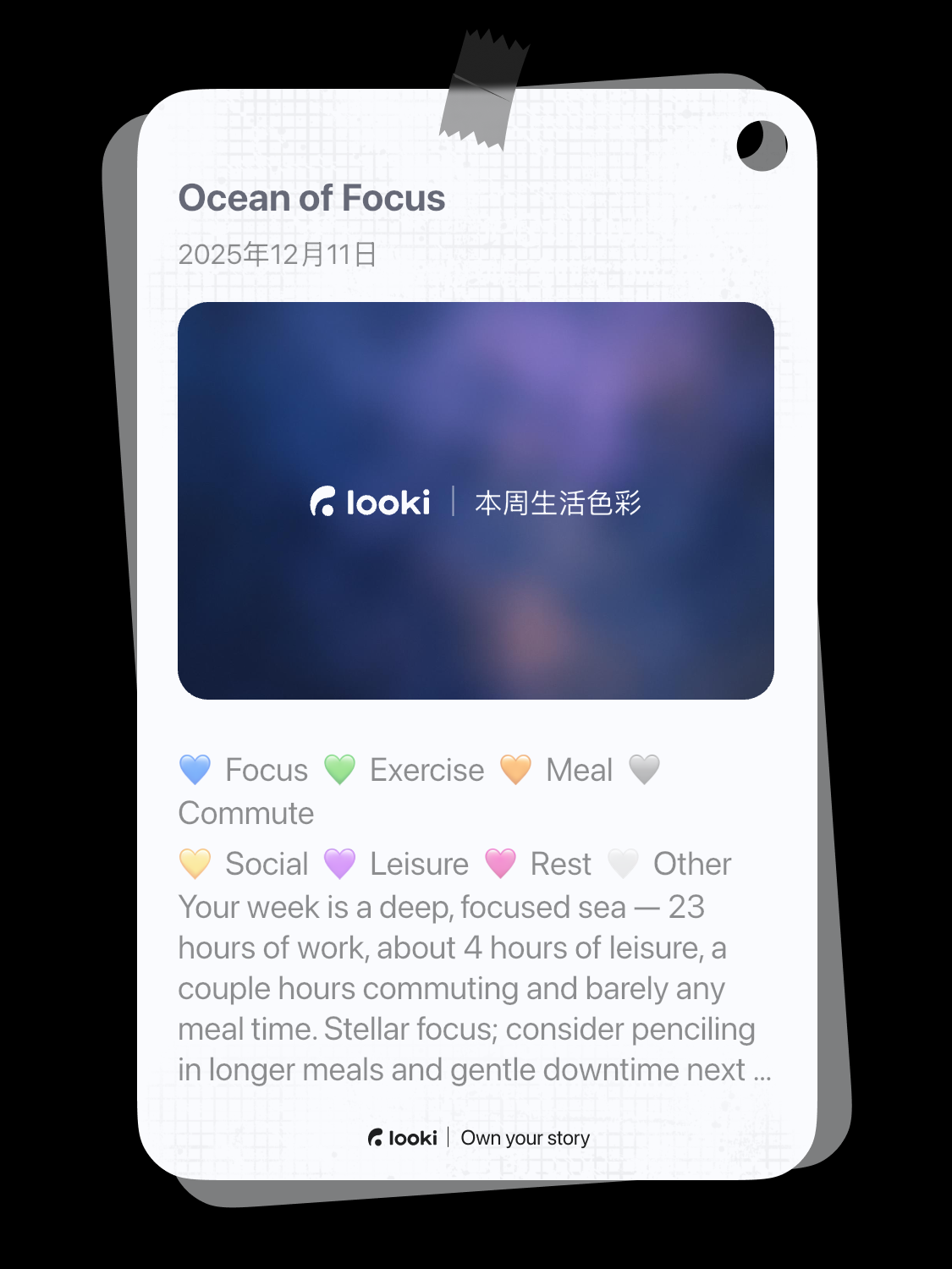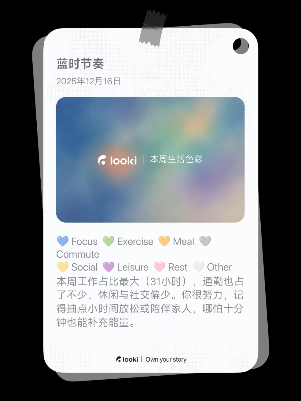 公司同事用Looki的一周总结功能pk了一下彼此的工作时长,猜猜分别哪个是CEO/产品经理/销售/UI/公关