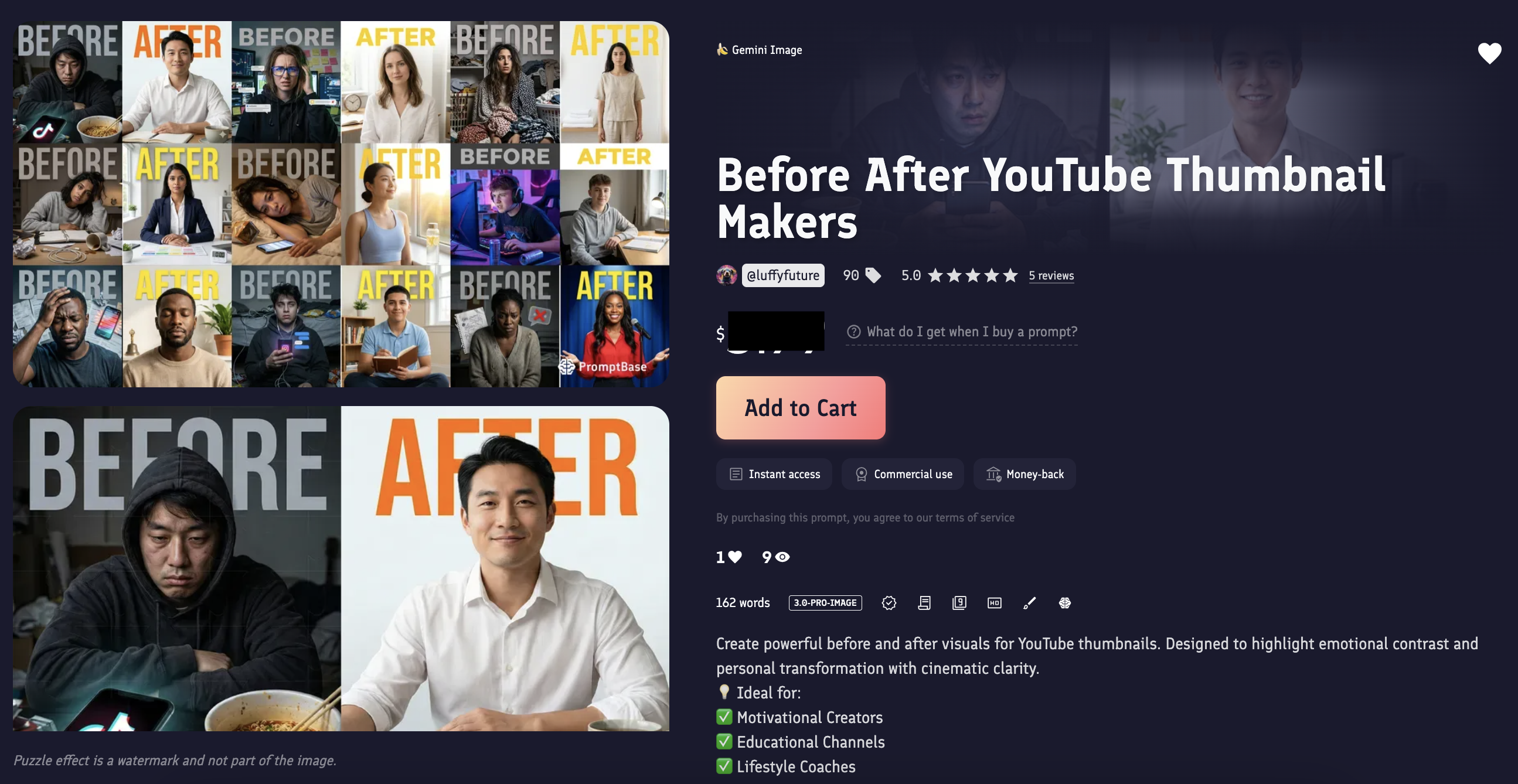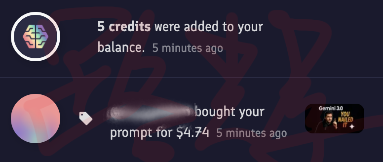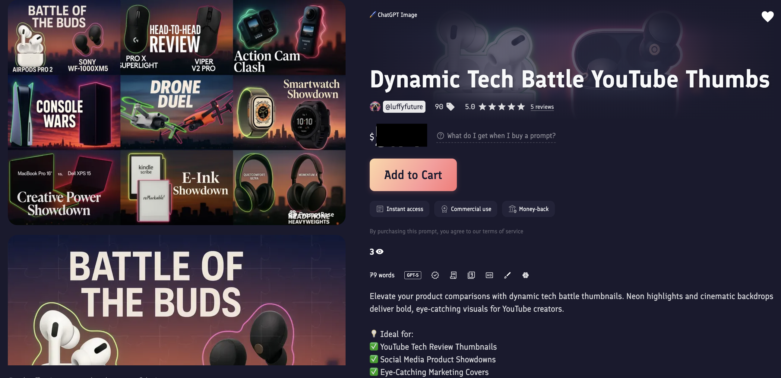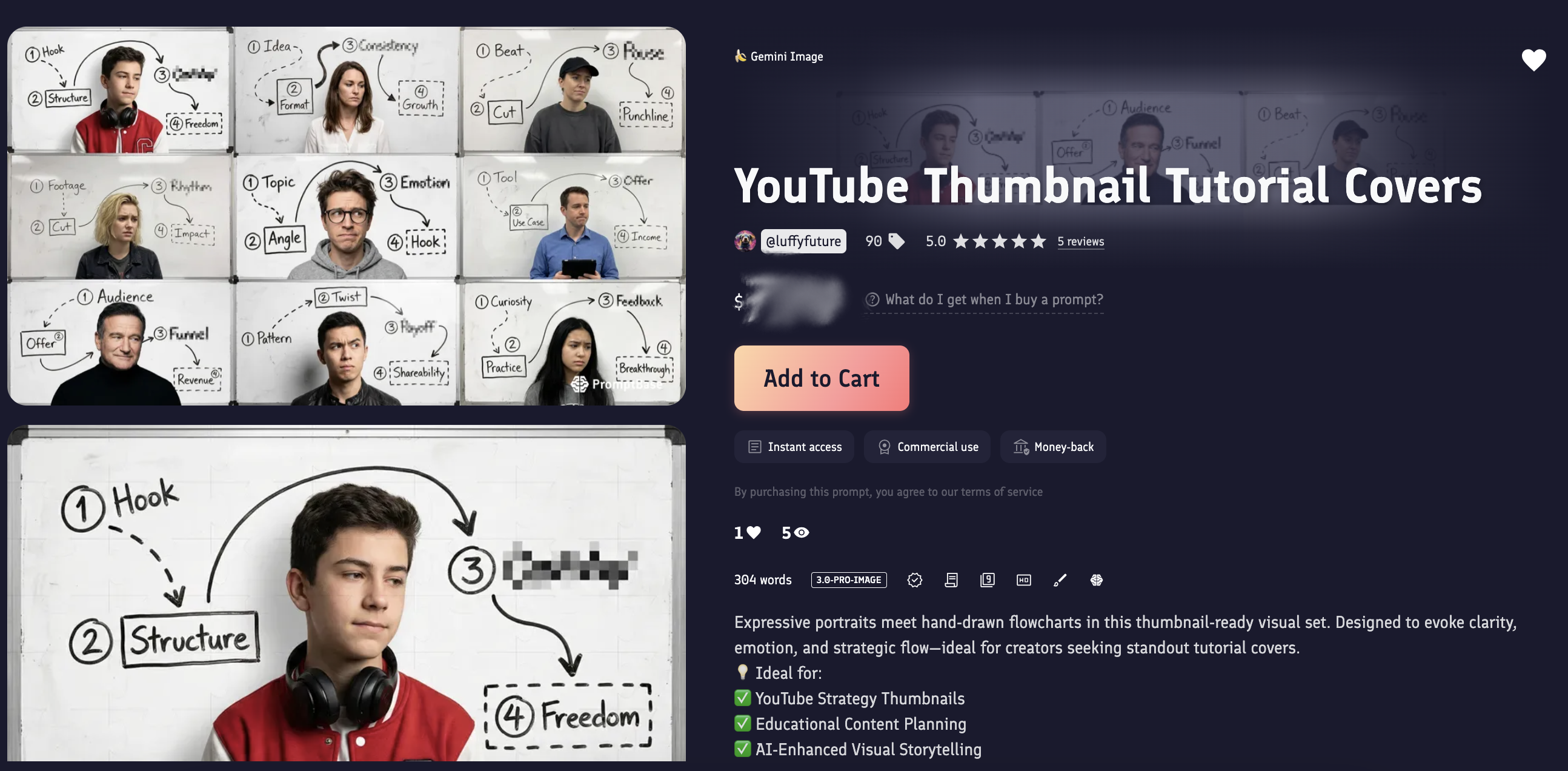 2、我在 Promptbase 已上架 7 组,$4.99-$7.99 成功卖出过,见图 1 打码。另外,图 2-4 和 6-9 是对应 7 组成品图。