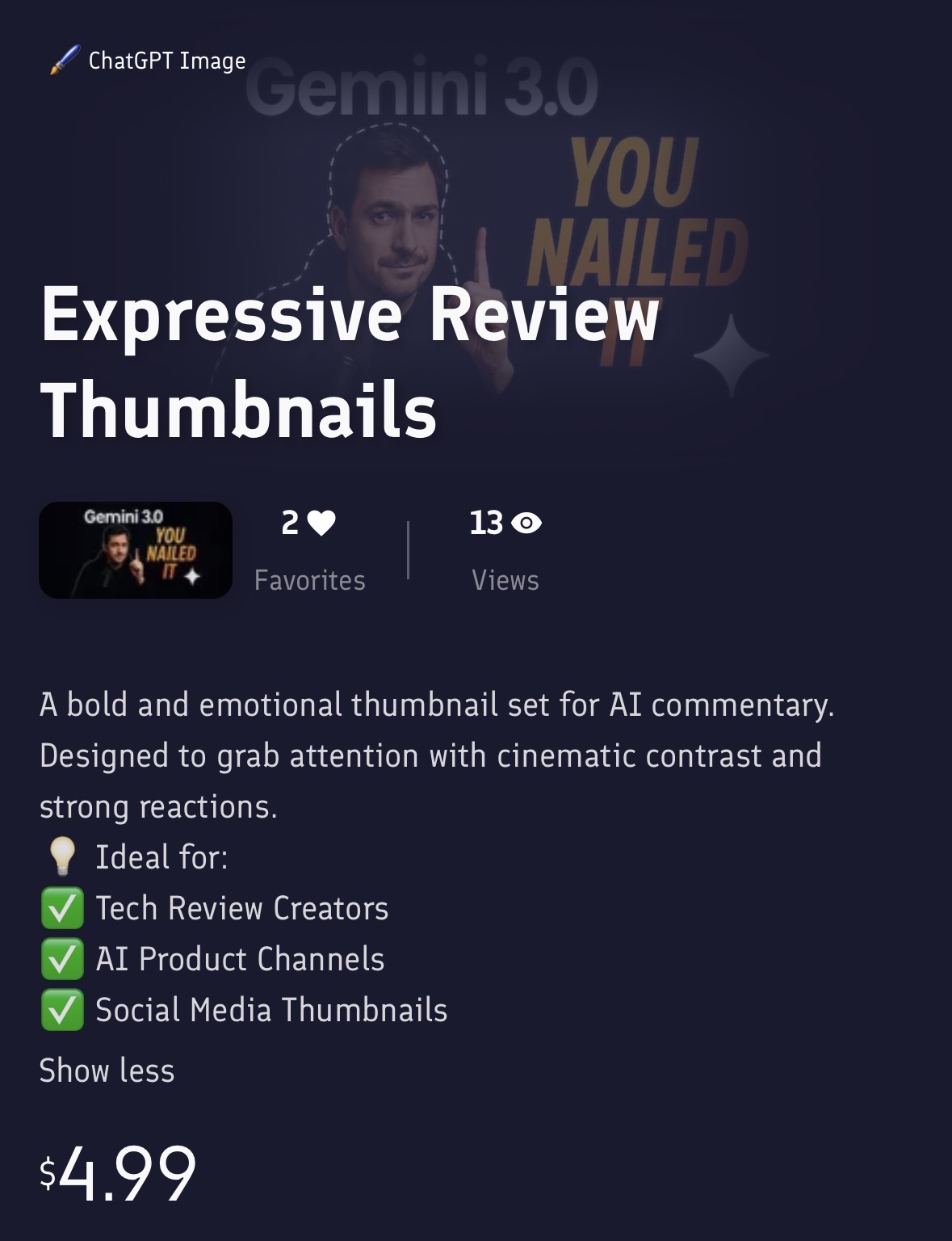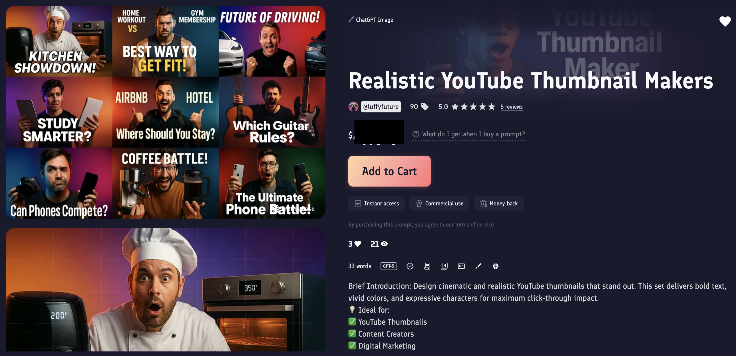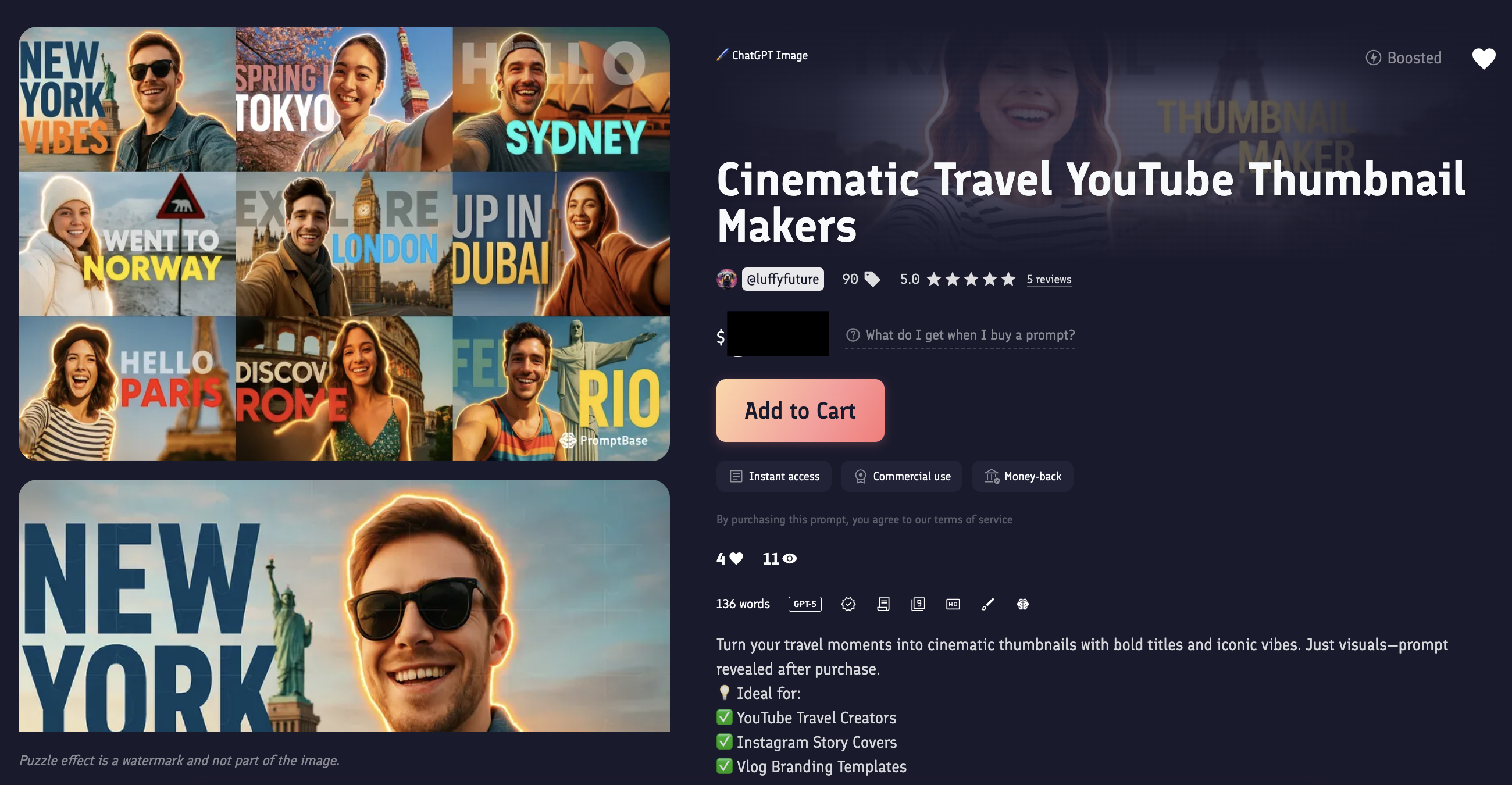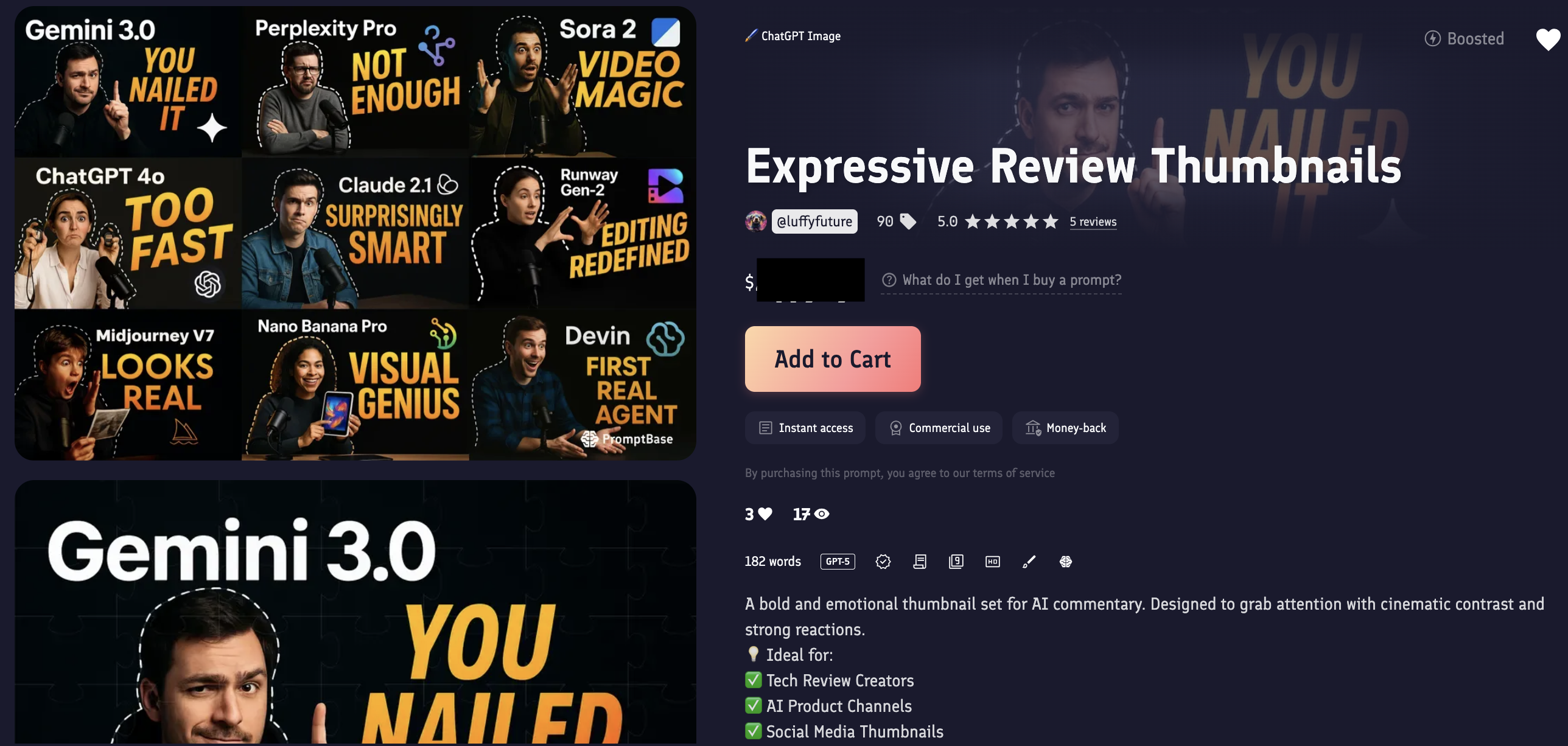 2、我在 Promptbase 已上架 7 组,$4.99-$7.99 成功卖出过,见图 1 打码。另外,图 2-4 和 6-9 是对应 7 组成品图。