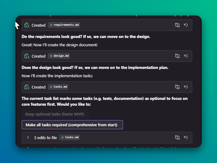 3,Kiro中的spec模式会把任务切分成requirements、design、task三大块。有问题可以及时提出让他改。