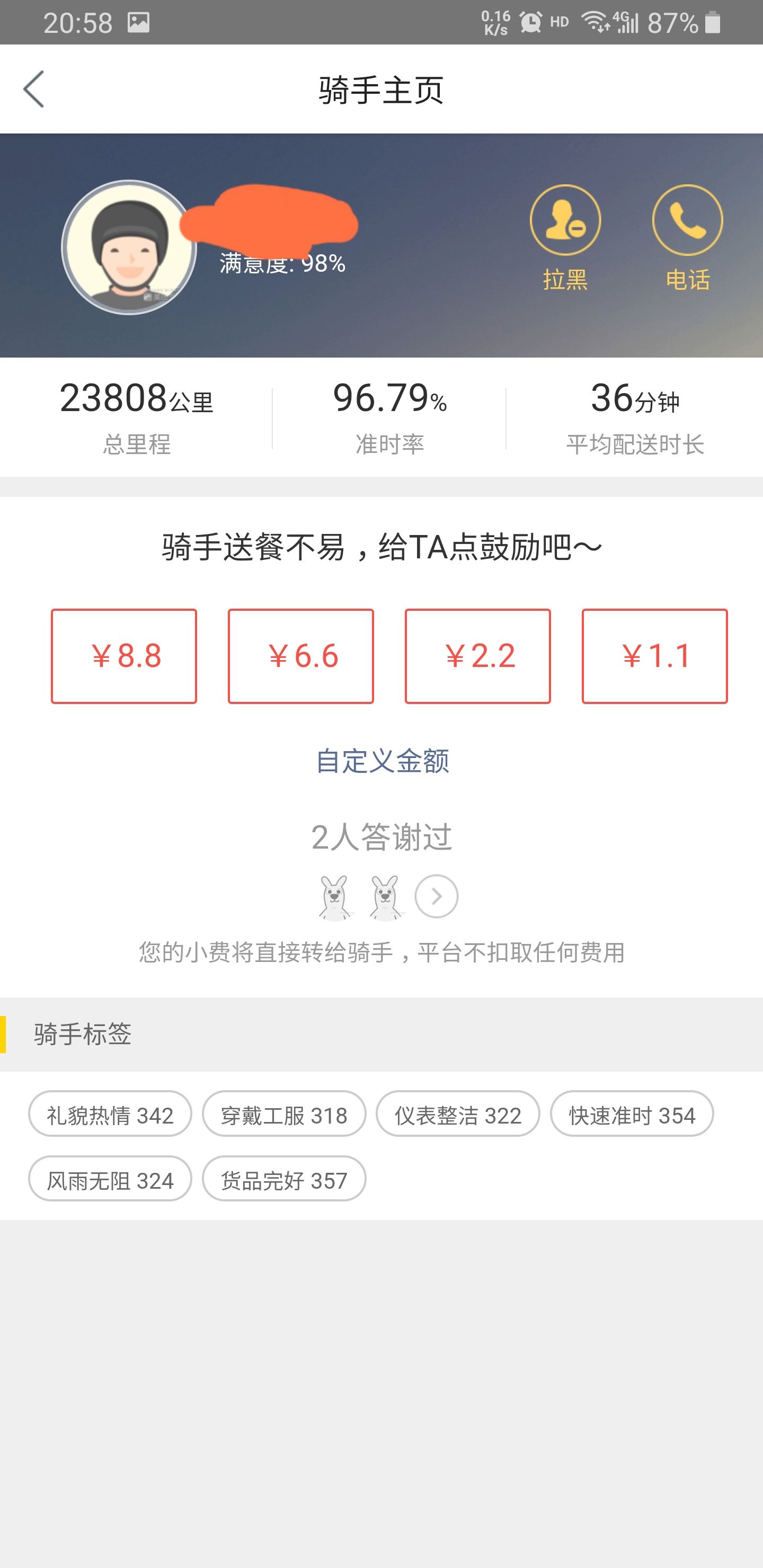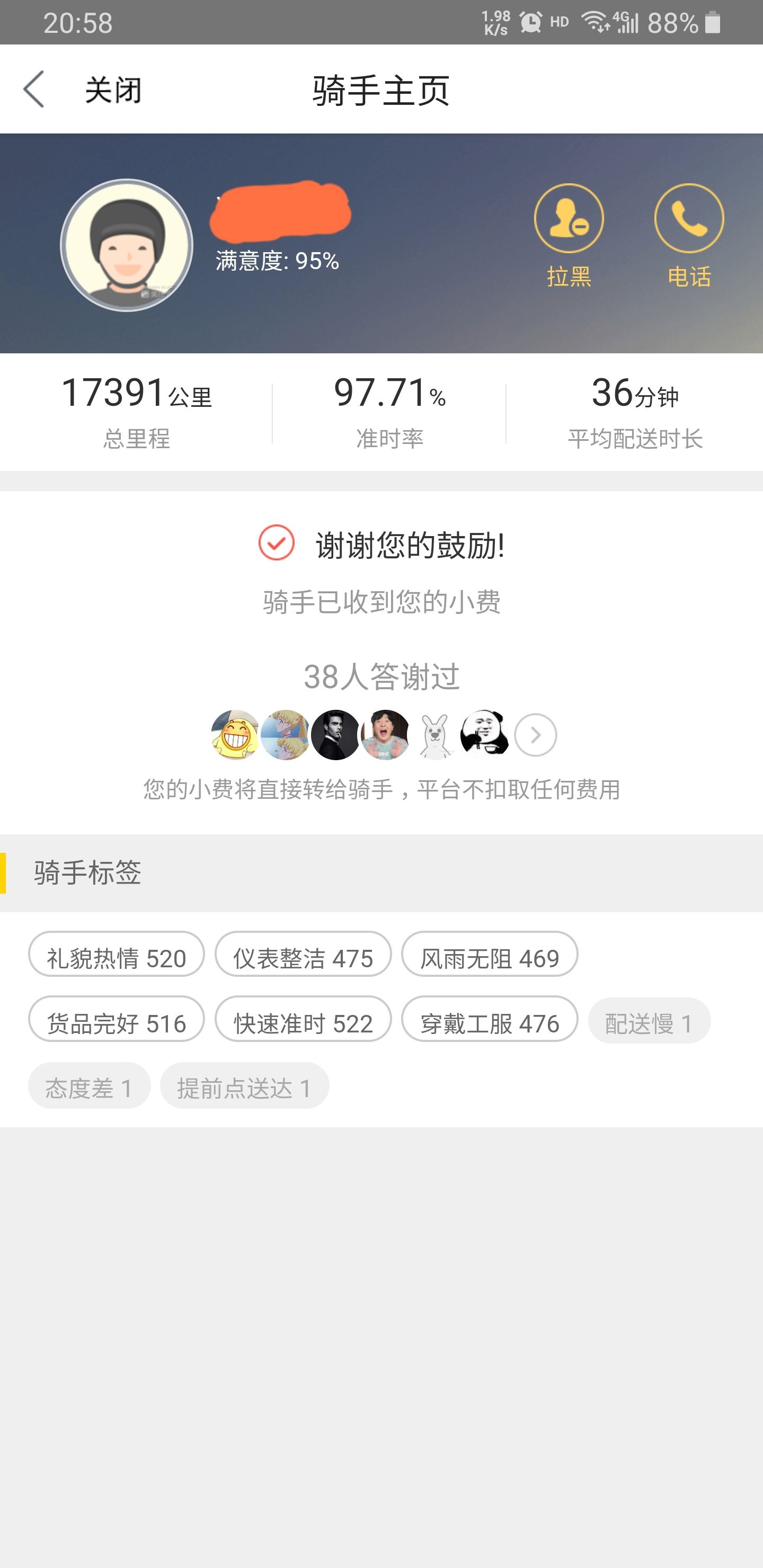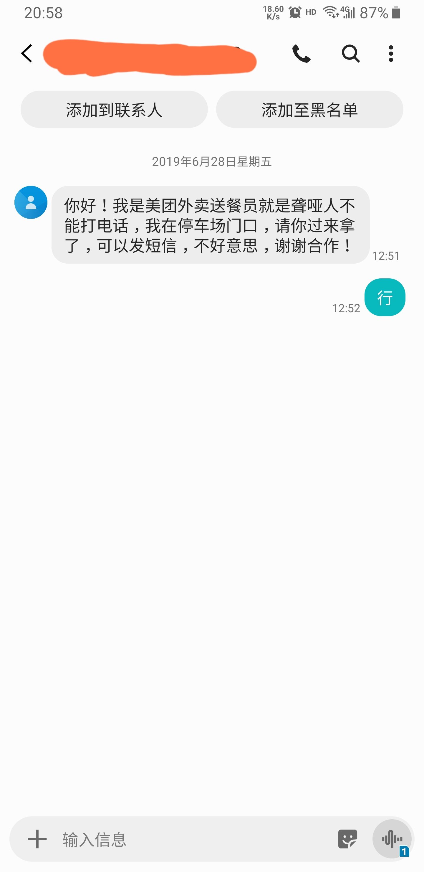 今天中午点了份外卖,接电话时就有些奇怪。电话那头没有说话,我以为是打错了,随后一条短信发了过来(图一)。我正往外面走,看到他在门口了,我挥了挥手示意,他发现了我。这时两只看门🐶,开始了它们的工作。他一边躲开🐶🐶,一边向我骑来。他停住车,指了指🐶,又指了指腿,我摆着手,大声说没事不咬人,说完谢谢,取走外卖,看着他躲着🐶,缓缓骑走。这两只🐶🐶,身体不大,叫声大,拦下过几次我的外卖,除非是外卖员不怕🐶,搞得我每次接电话就说,你不怕🐶就能骑进来。往回走时,我在想谢谢好像有些单薄,这时我想到他这单外卖送超时了(图二)。给他打赏回去吧(图三图四图五)。打赏时发现他被打赏的次数还挺多,大善人还真不少。我再去看了看另一位送餐员(图六),他的打赏次数明显少一些。聋哑人还是更不容易,更让人同情。又想到上次也是外卖送超时了,他给我打电话就急匆匆的,问我在哪在哪,我都没看到你人。当他骑到我面前我才发现是送外卖的,一对中年男女,女士手上拿着外卖,送餐大盒子都没有,穿着便装,我还寻思这电动车是不是迷路了,取走外卖,甩下一句谢谢。我每次点外卖可都是盯着外卖员的地图看的,还有几百米的时候我就走到外面去了,送餐员每次电话一打来,我小手一挥,他就能看见,多快多方便。还有这个准时宝是商家送的,我平时都不加这个,没必要。