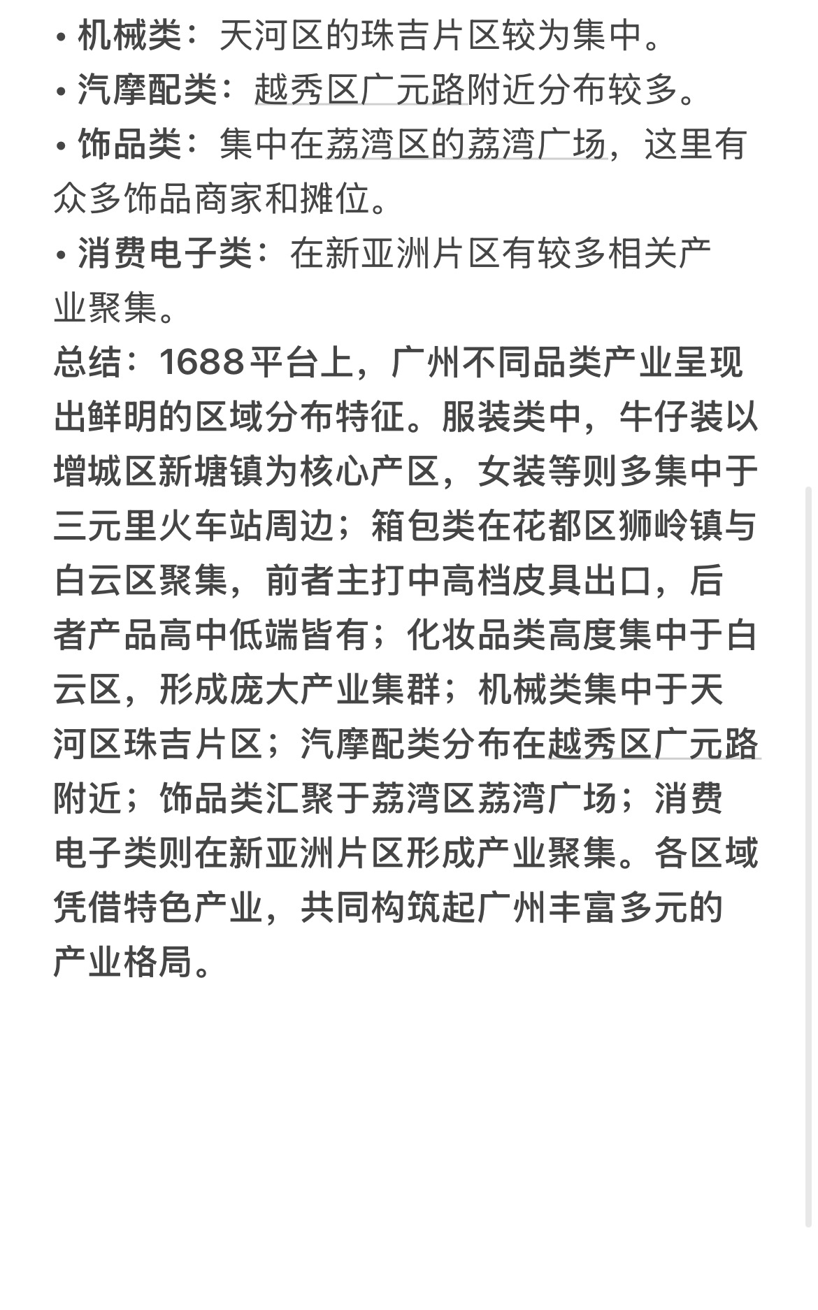 总结:1688平台上,广州不同品类产业呈现出鲜明的区域分布特征。服装类中,牛仔装以增城区新塘镇为核心产区,女装等则多集中于三元里火车站周边;箱包类在花都区狮岭镇与白云区聚集,前者主打中高档皮具出口,后者产品高中低端皆有;化妆品类高度集中于白云区,形成庞大产业集群;机械类集中于天河区珠吉片区;汽摩配类分布在越秀区广元路附近;饰品类汇聚于荔湾区荔湾广场;消费电子类则在新亚洲片区形成产业聚集。各区域凭借特色产业,共同构筑起广州丰富多元的产业格局。