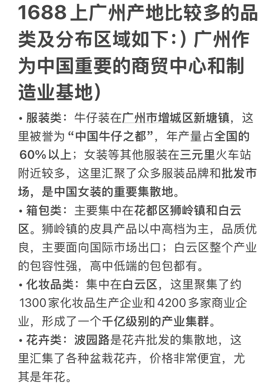 1688上广州产地比较多的品类及分布区域如下:)广州作为中国重要的商贸中心和制造业基地)