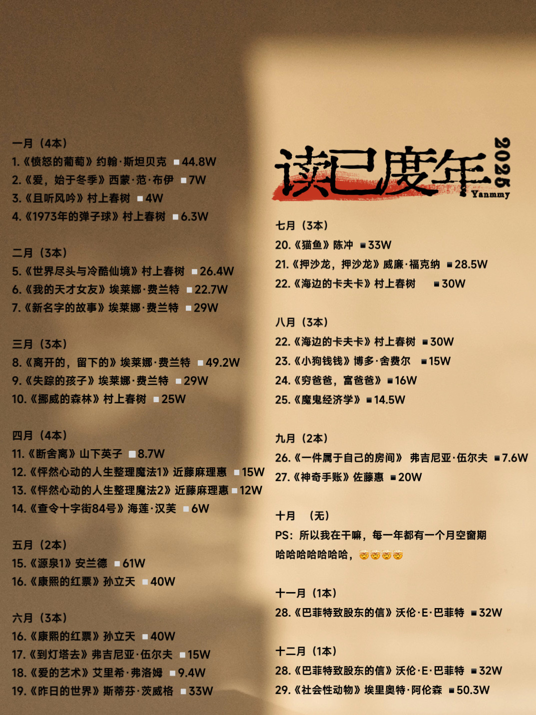 你好啊,2026,你好啊,新的你。合上书的那个下午,新的故事又要开始提笔了。书比从前少了一半,人比从前沉淀了不少,不在周遭的事情过分执着,不再向无解的事情追问答案。2025的故事落了笔,一片安静。这个世界受我们自身的情欲而东倒西歪,这个世界不真实地坍塌,不真实地重造,有多少个自我,就有多少个世界并行。2025,关上了灯,关上了门,地板骤冷,气温凝固,好了。走了,就别回来了。