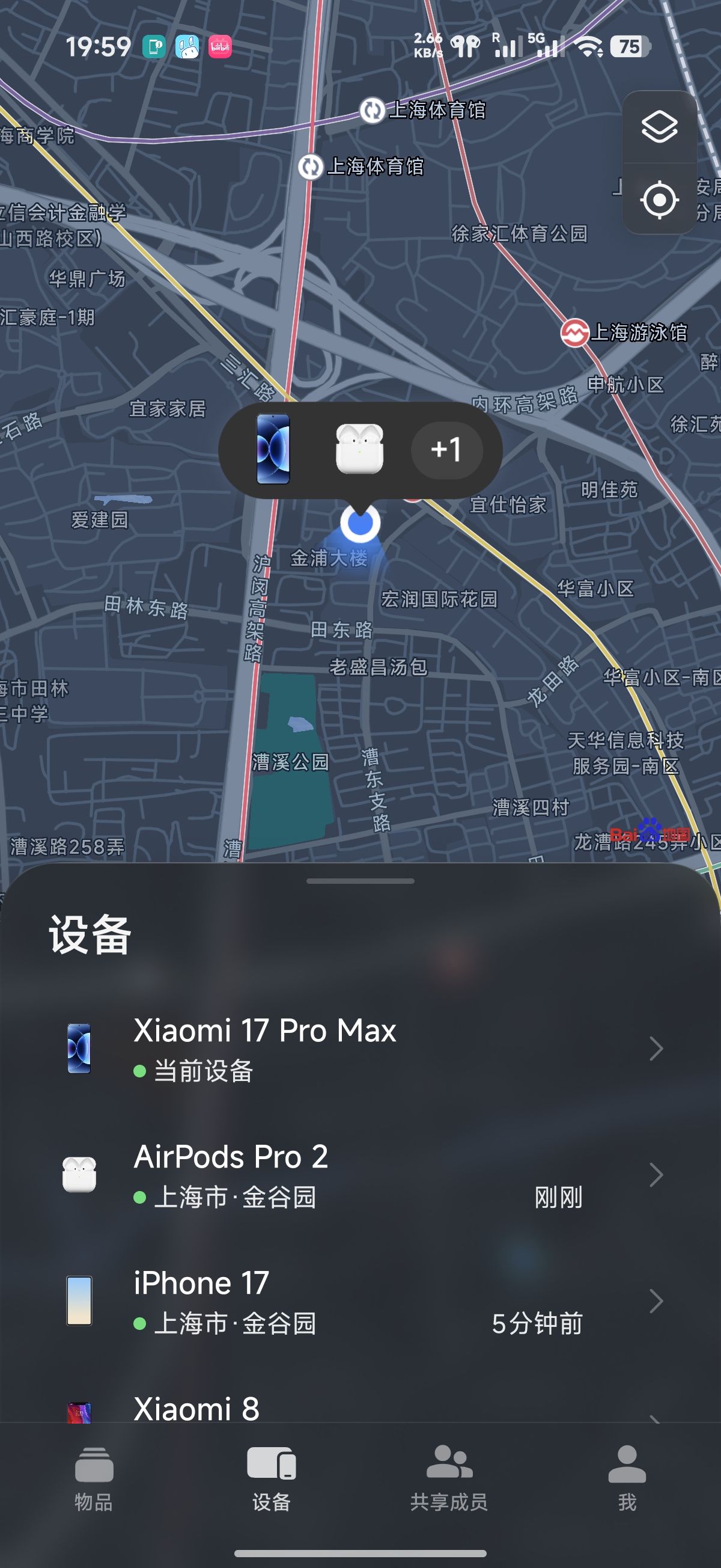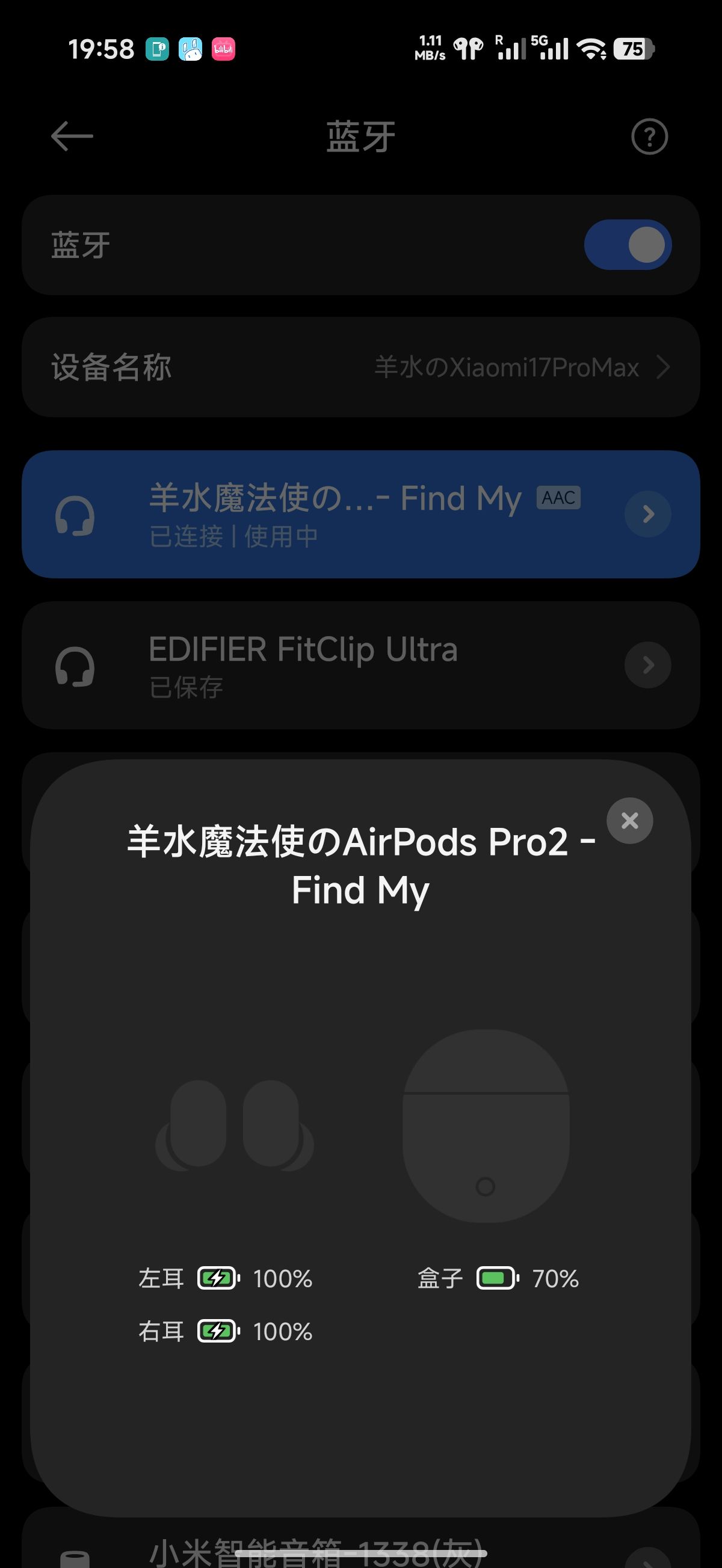 AirPods改姓米了,小米手机17ProMax上可以显示弹窗(弹窗图标应该是首次连接还没加载出来)、耳机盒电量、耳机设置、控制中心设置、小米查找APP位置。