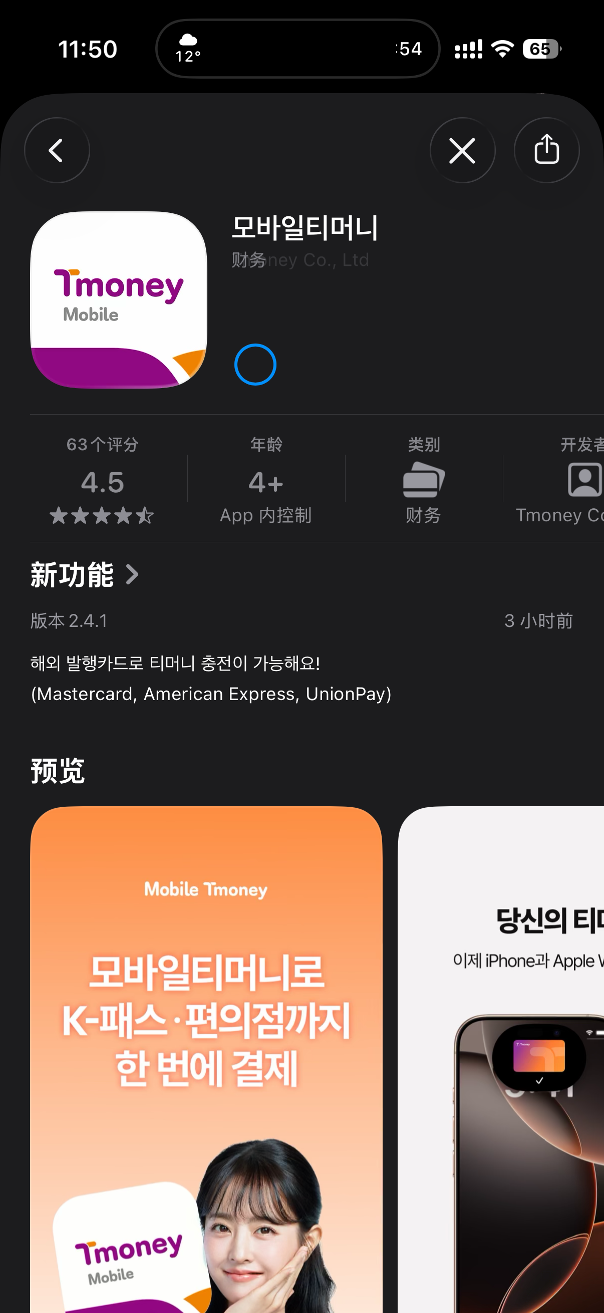 iOS端小韩民国Tmoney APP可以用海外银行卡充值了,支持万事达、美国运通、银联。