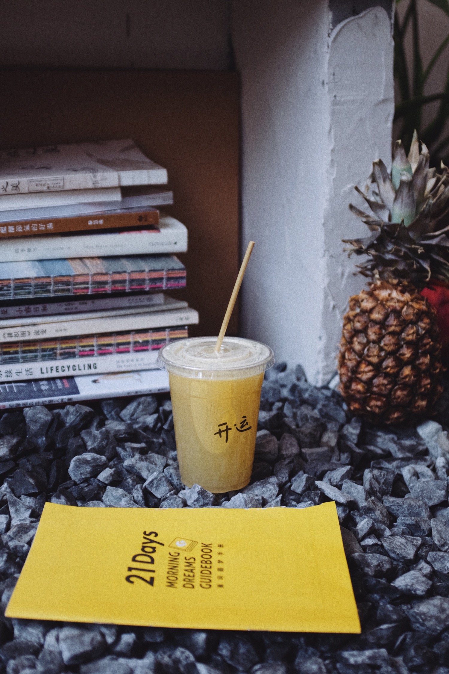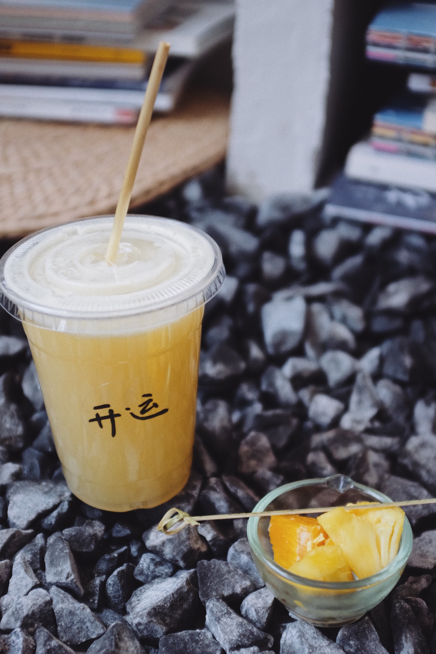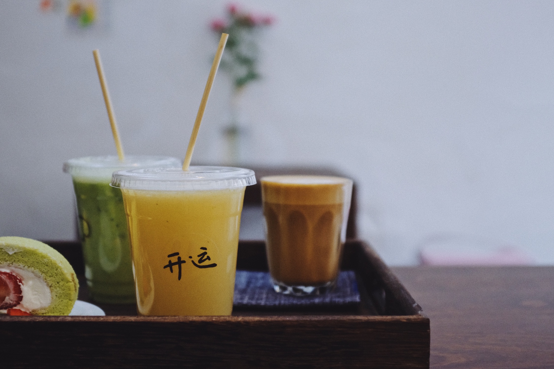 鲜榨果汁都很健康而且颜色很好看,透明杯上写着开运