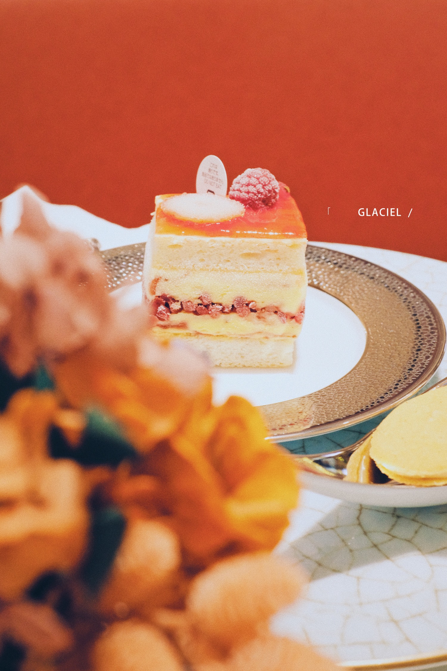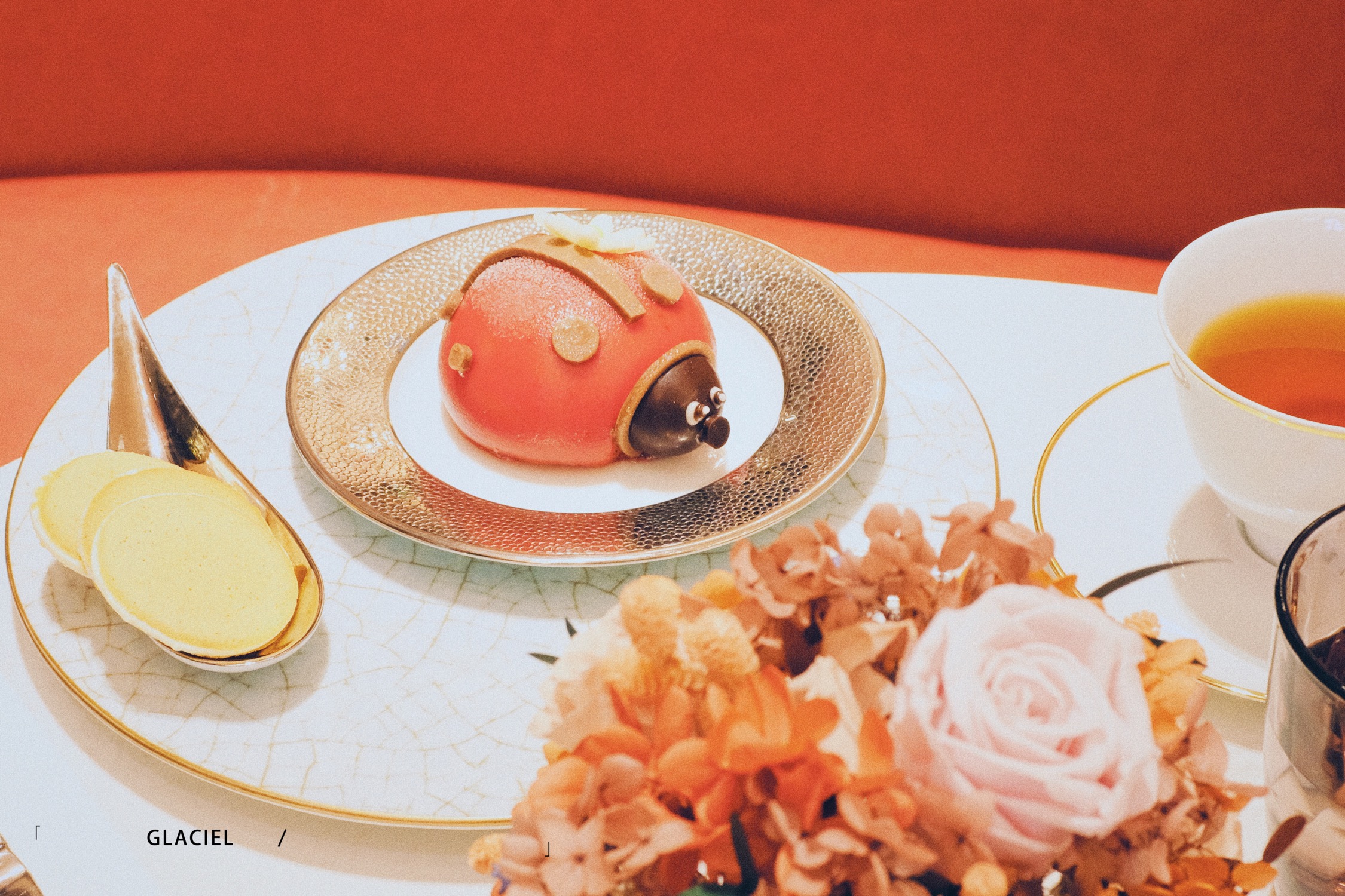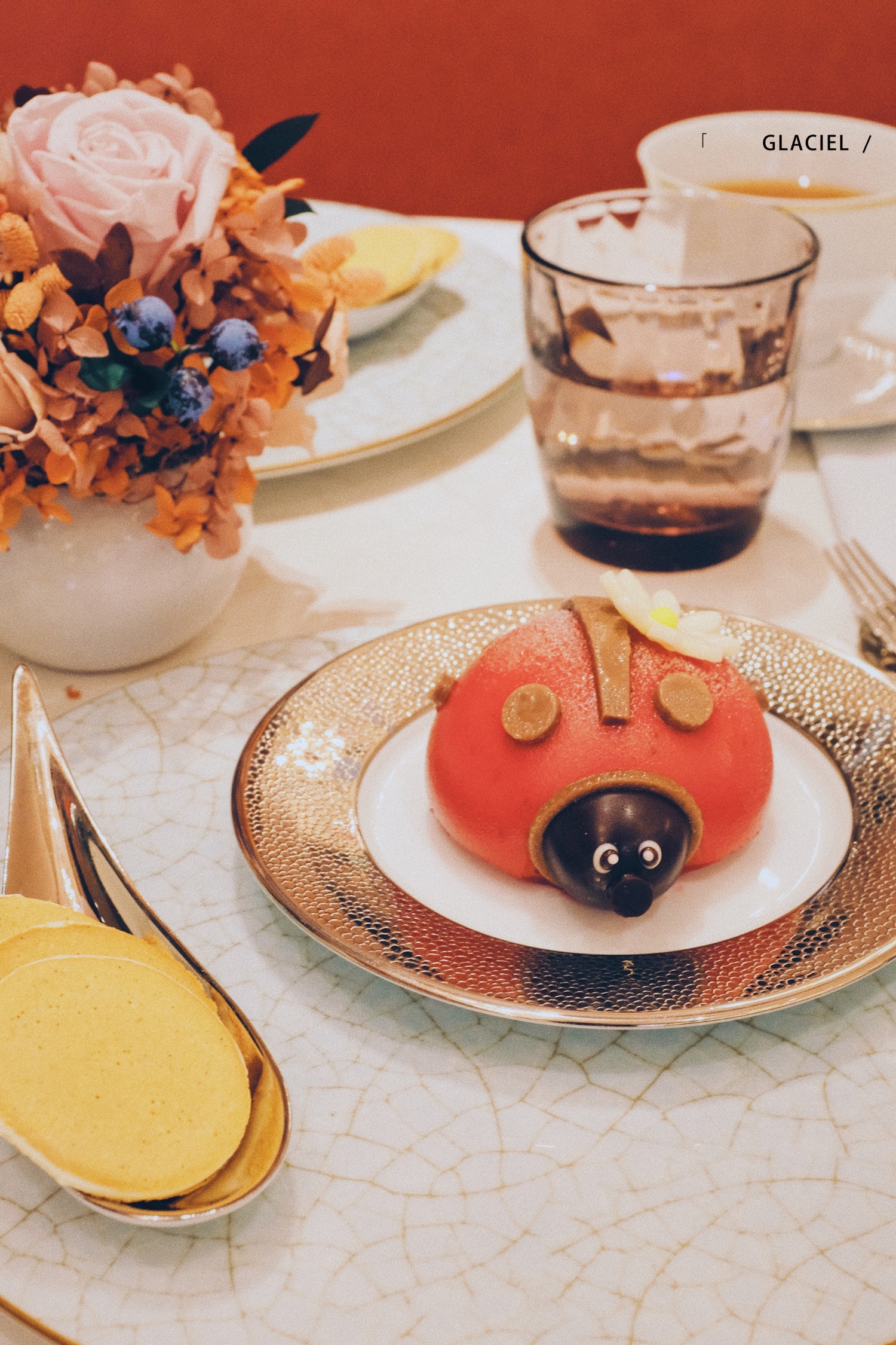 代表幸运的红色瓢虫,外皮是覆盆子淋面,切开瓢虫,内部是香草冰激凌+覆盆子雪芭+蛋糕胚!酸酸甜甜又可爱!