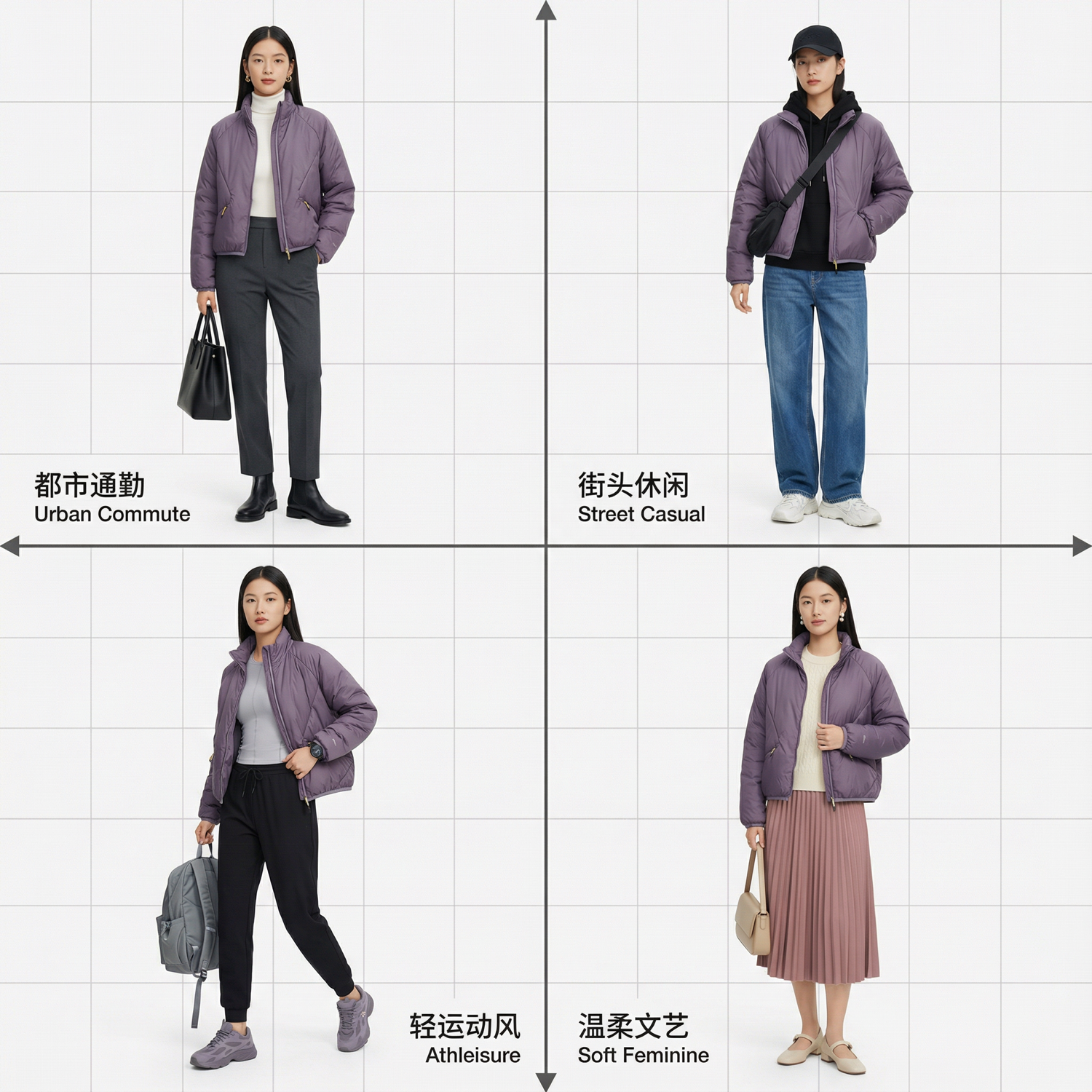 并且每一套方案生成完整的搭配效果图,4套搭配拼成一个 2 乘 2 的大图,并且用坐标轴区分开,每一个风格下面有小字注明风格,使用 Nano Banana Pro 模型生成