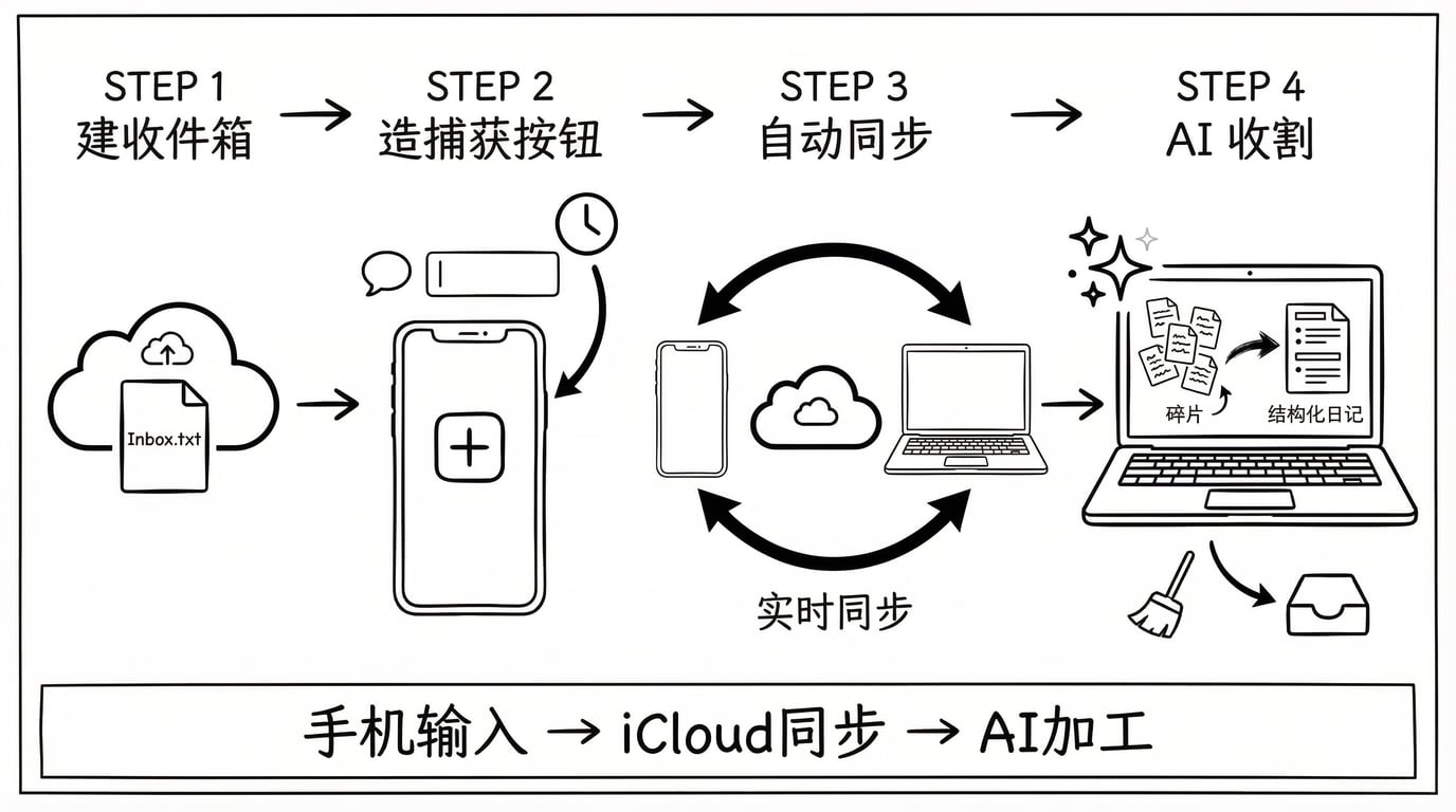 第三步“自动同步”:因为 Inbox 文件存在 iCloud 里,而 Mac 电脑天然跟 iCloud 实时同步。所以你白天在手机上写进去的东西,晚上打开电脑就已经自动在了,不需要任何手动操作。