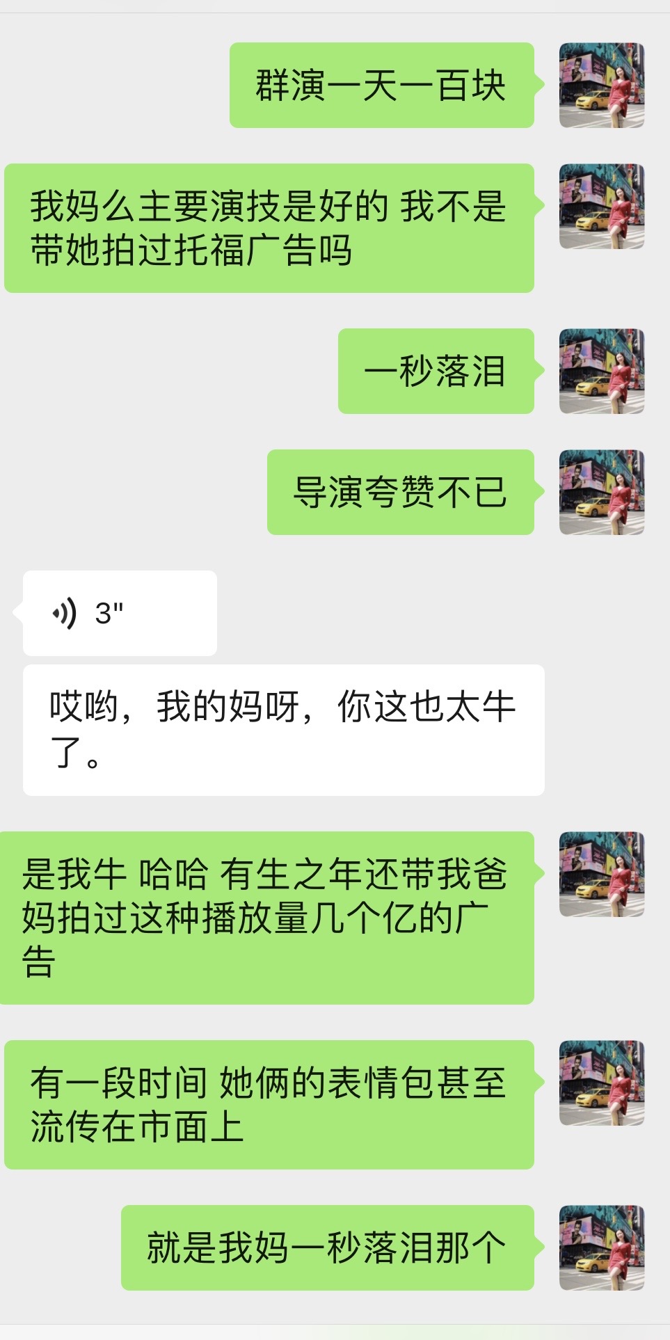 我说我大学的时候就带我爸妈拍过托福官方的广告了