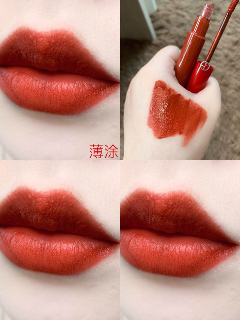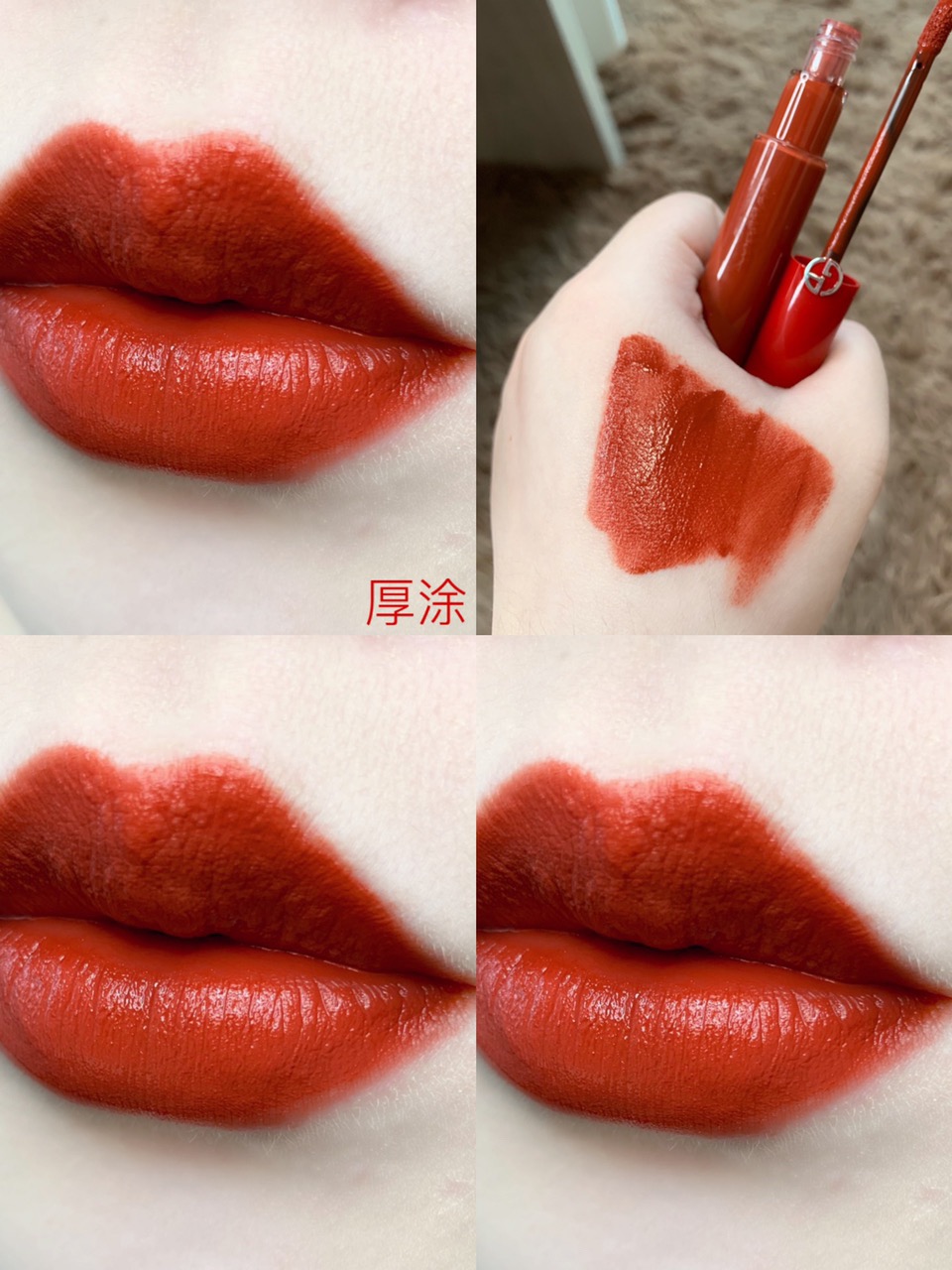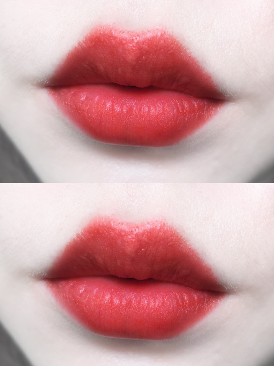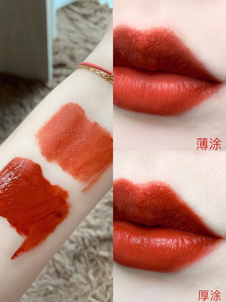 涂上嘴的颜色会比手上的试色稍红一些,中和了一些橘调,更贴合自身的肤色,超级好看!不管唇色深浅冷暖,这支都很搭!