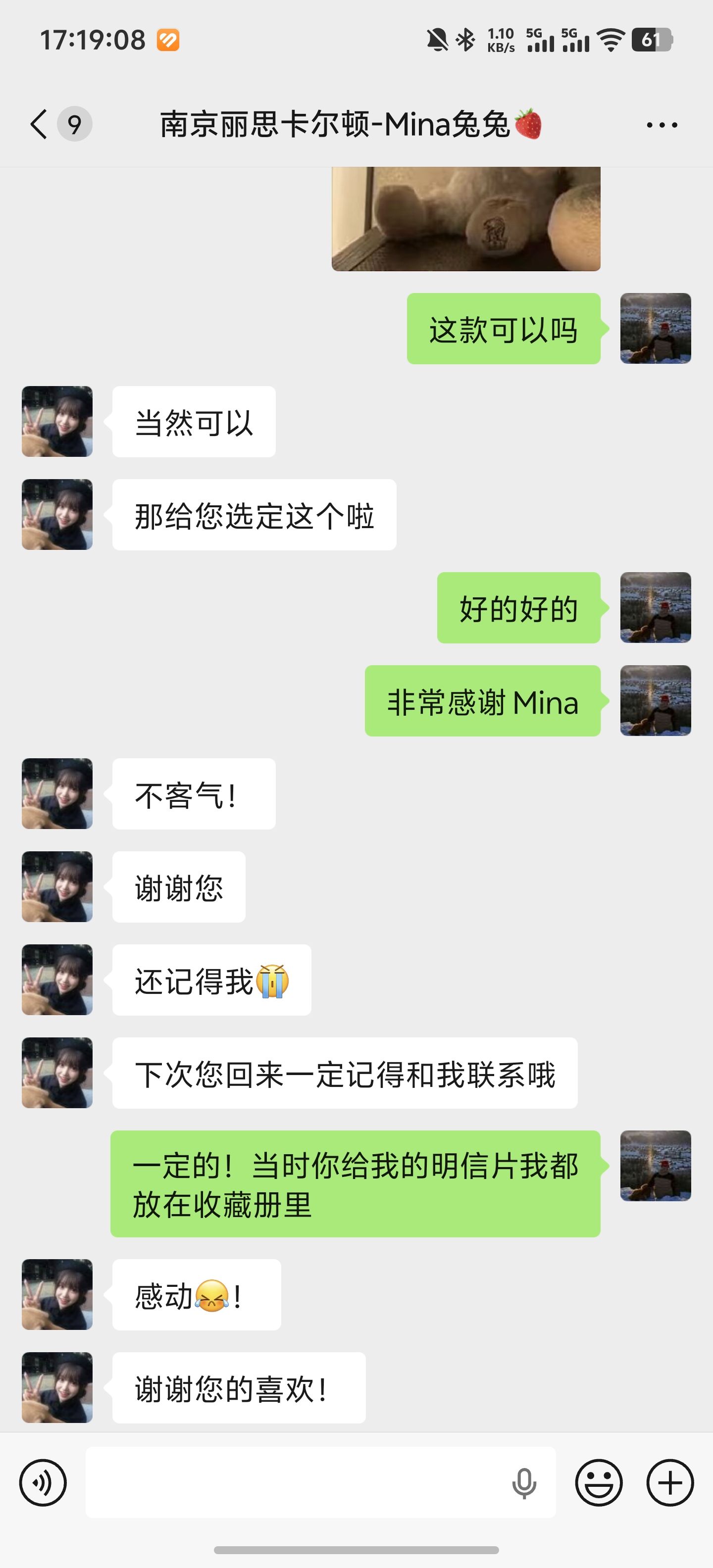 我找到了24年入住时接待我的Mina小姐姐,想问她是否购买酒店的玩偶来用掉这张礼品卡,她帮我联系了同事并且告知我可以,然后让我挑选。