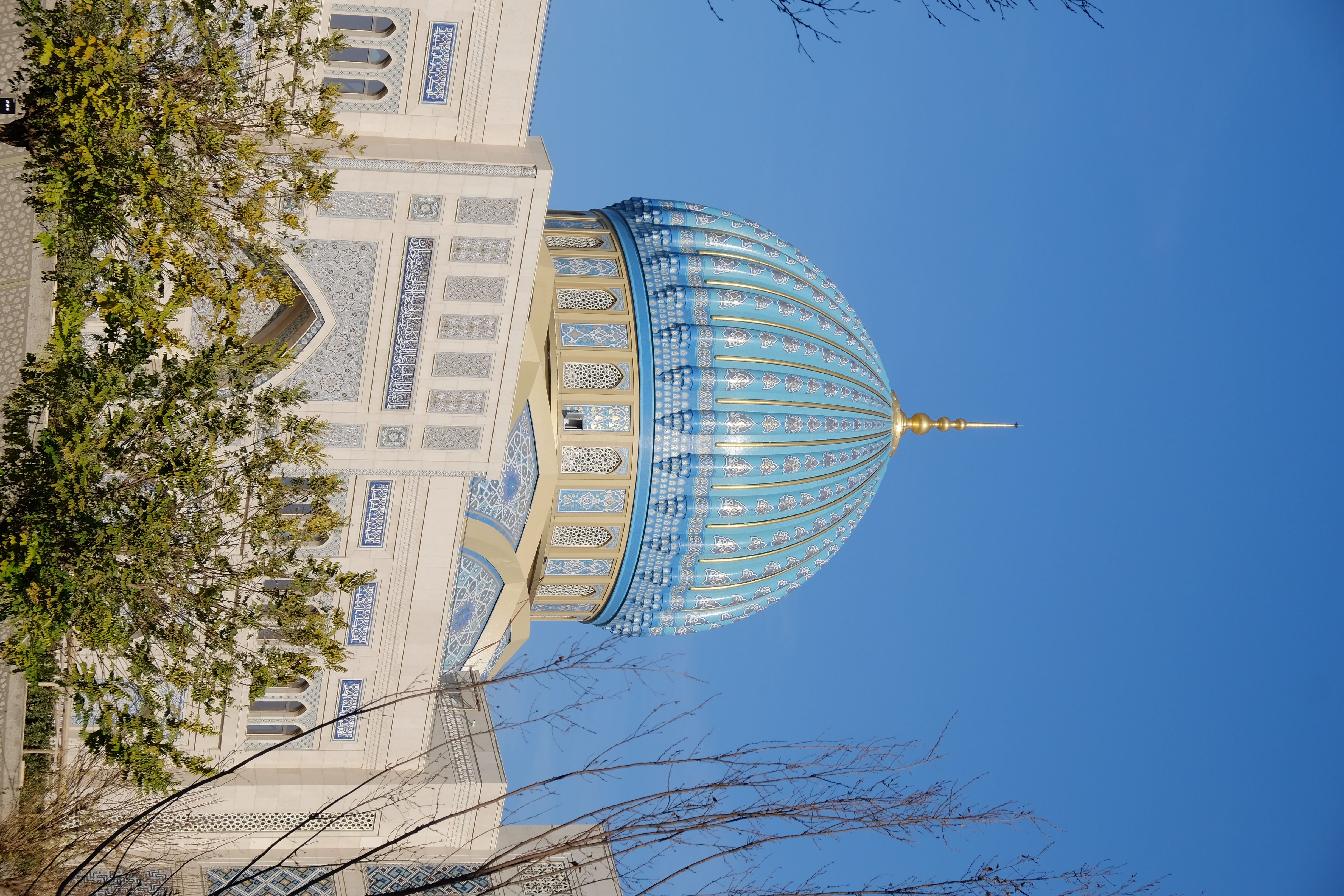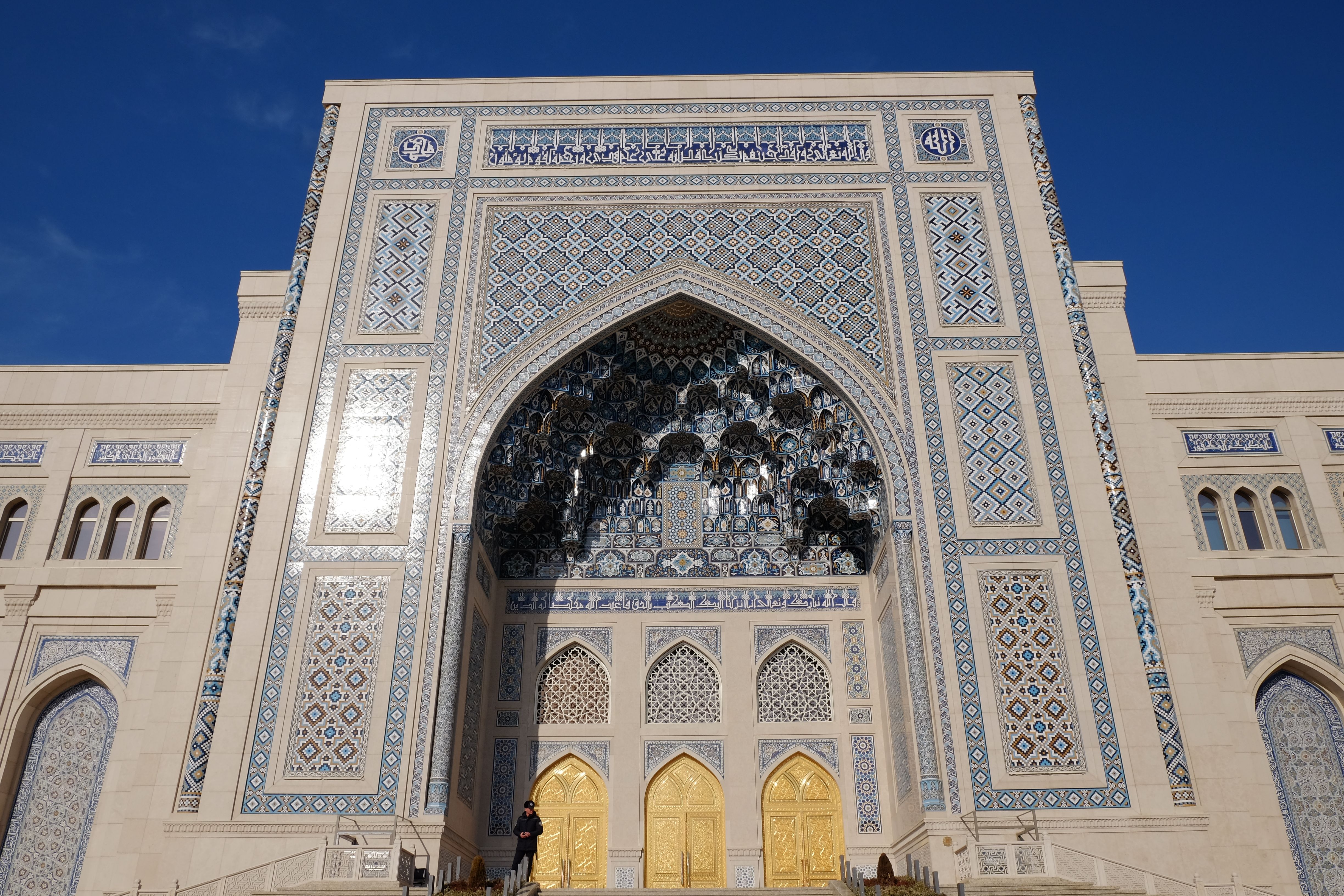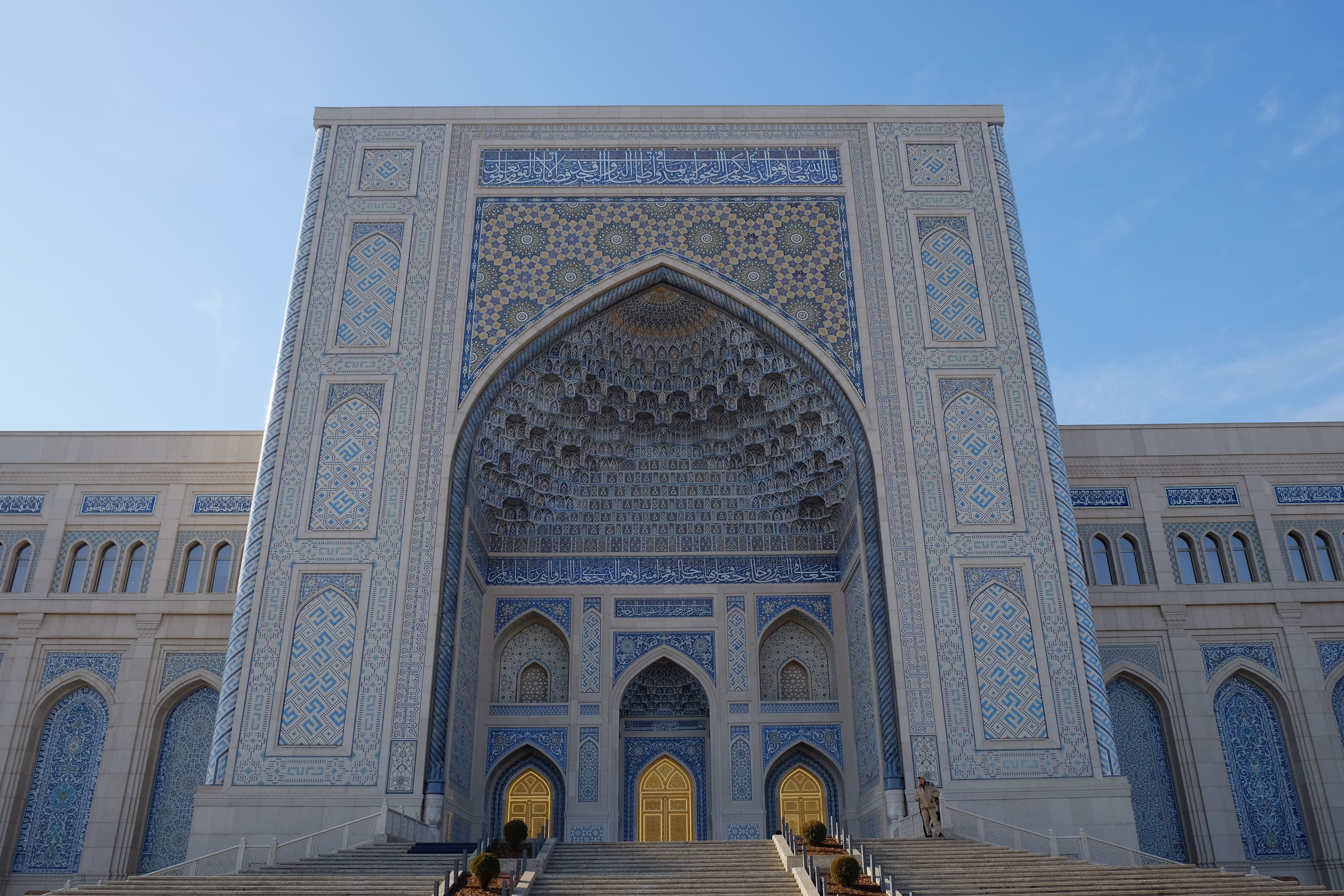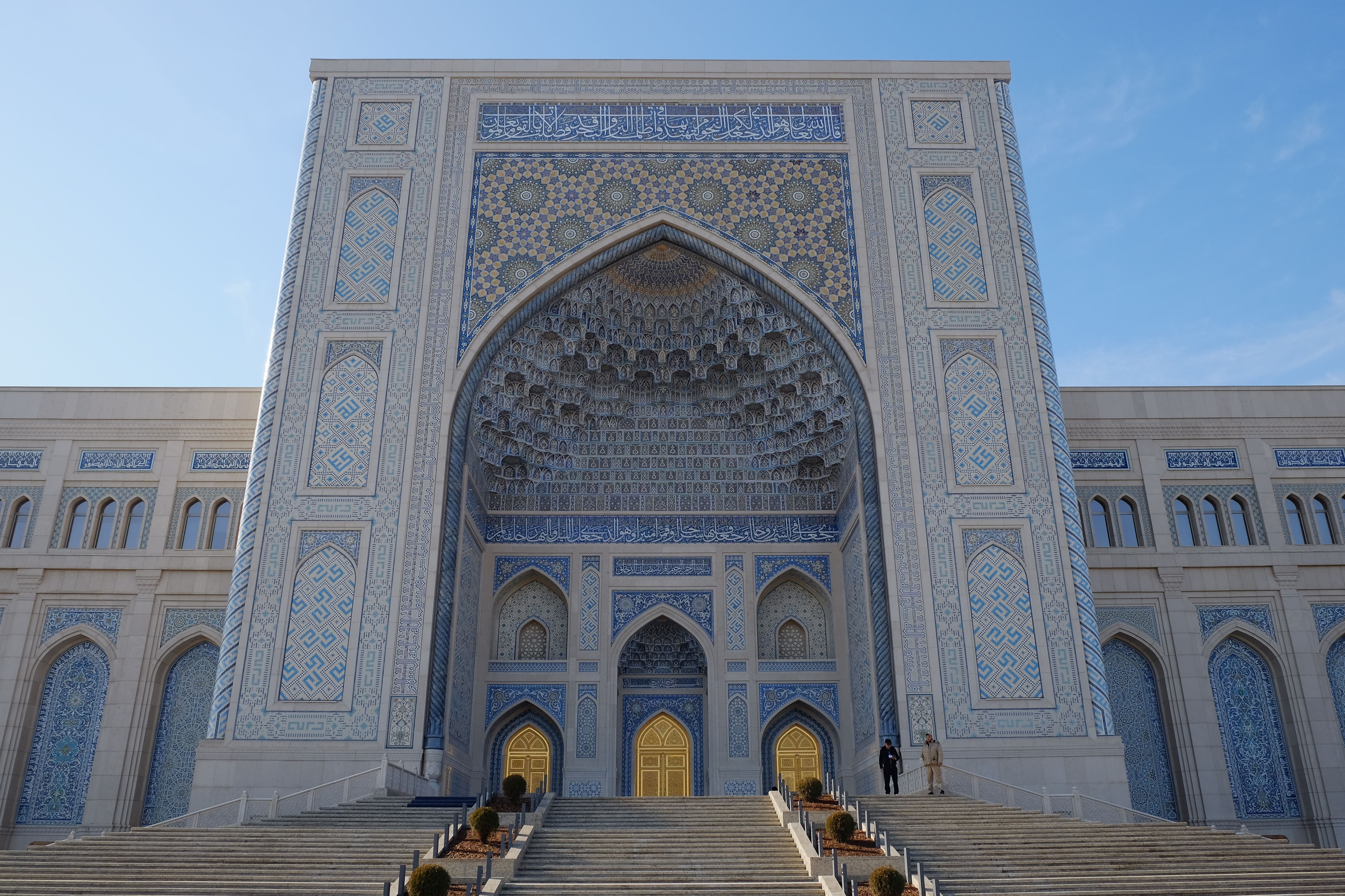 塔什干的世界伊斯兰文化中心四面均建有精美的Iwan,中央为巨大的穹顶(可惜不开放无法欣赏内部),尤以北面的Iwan最为精美(图1-4),可以看到其内部所开三扇门又嵌套了小型的Iwan。