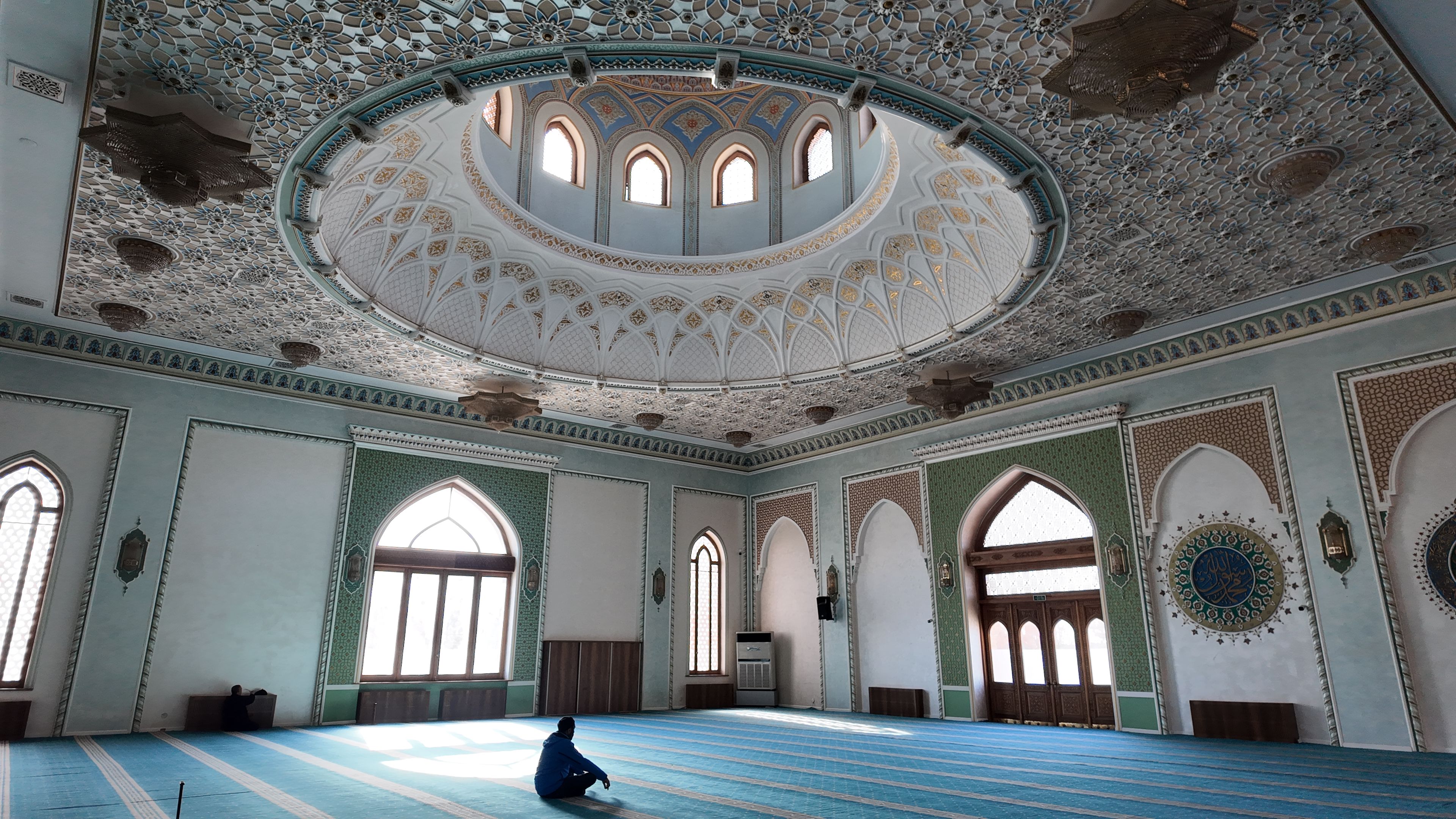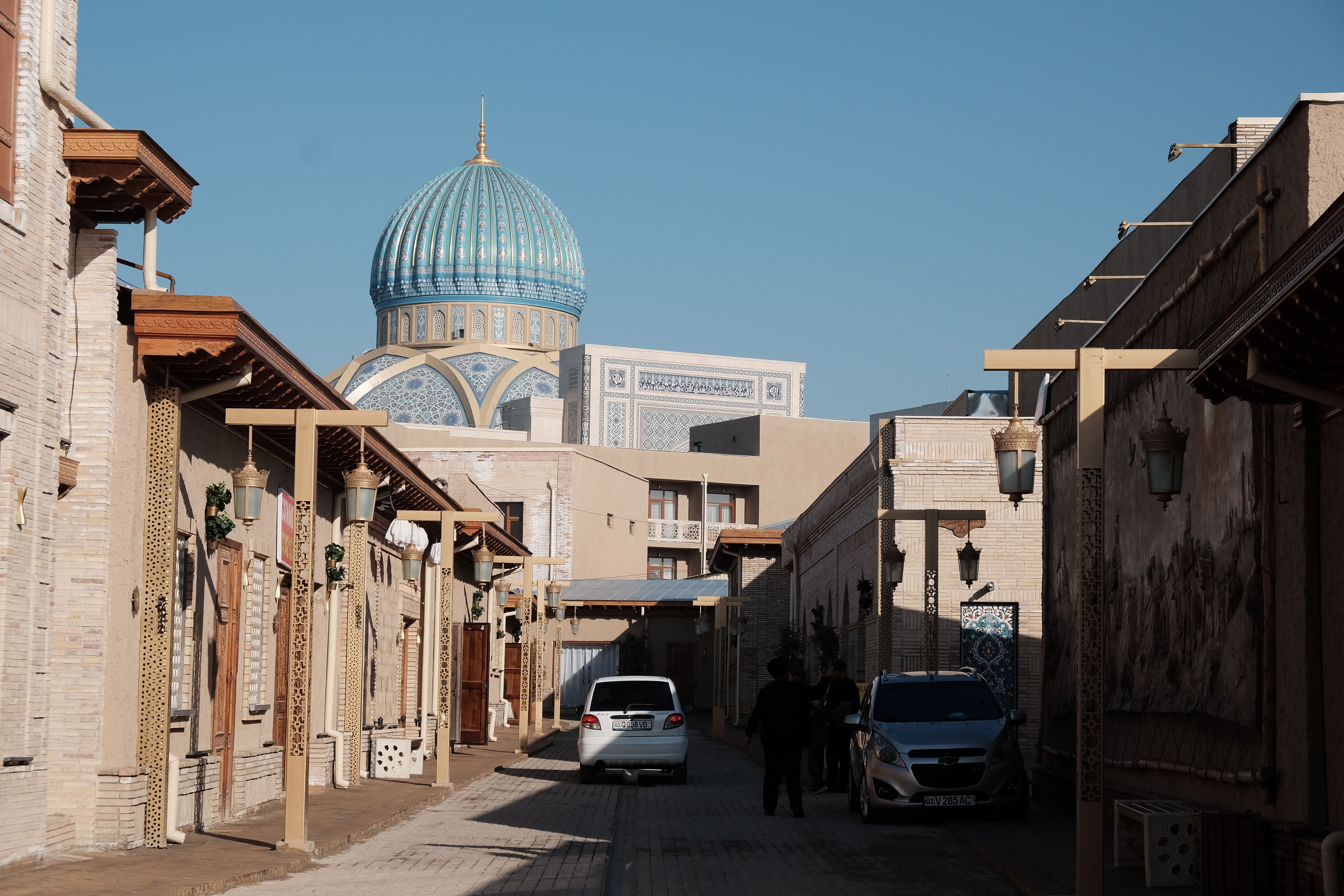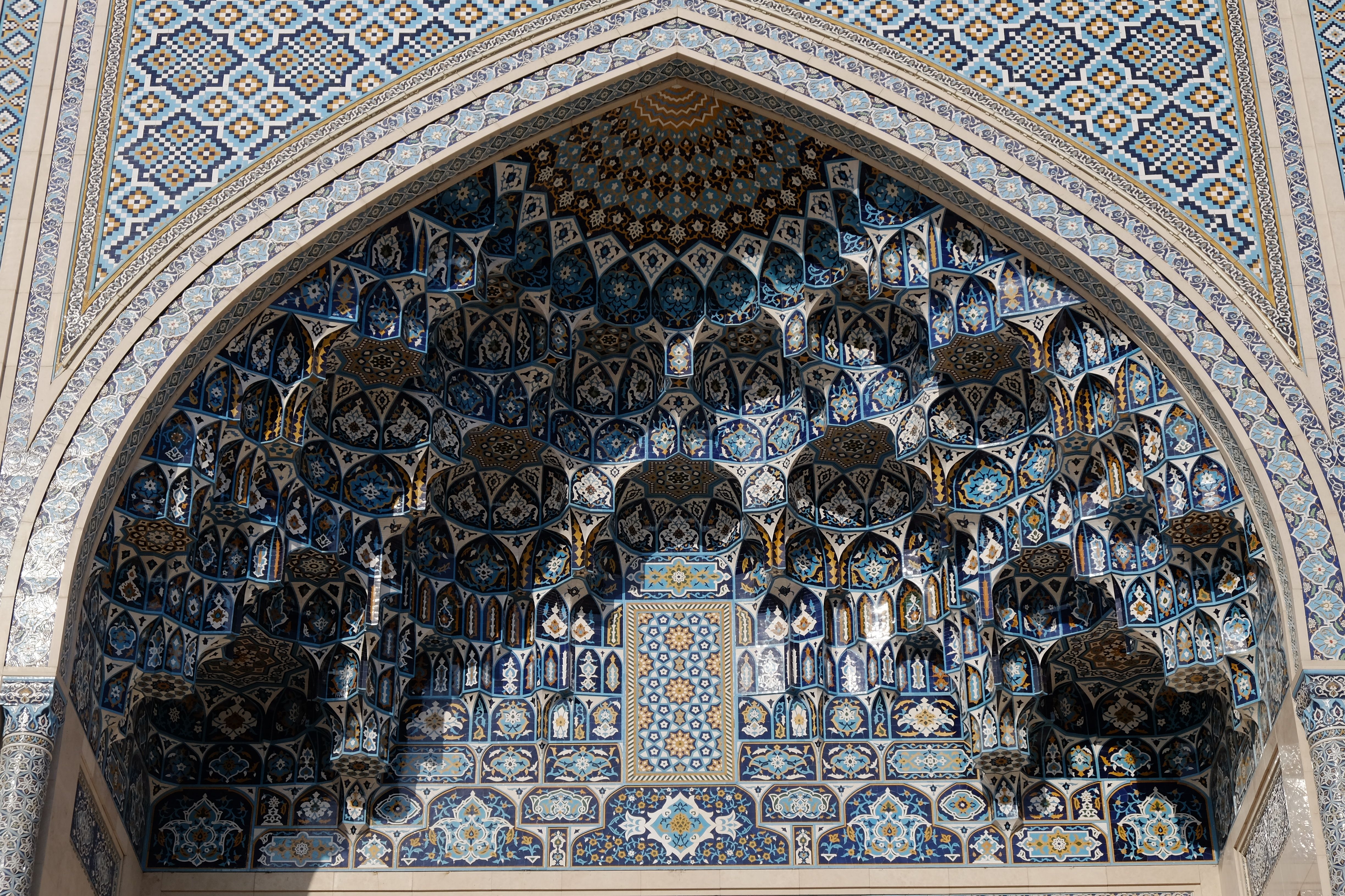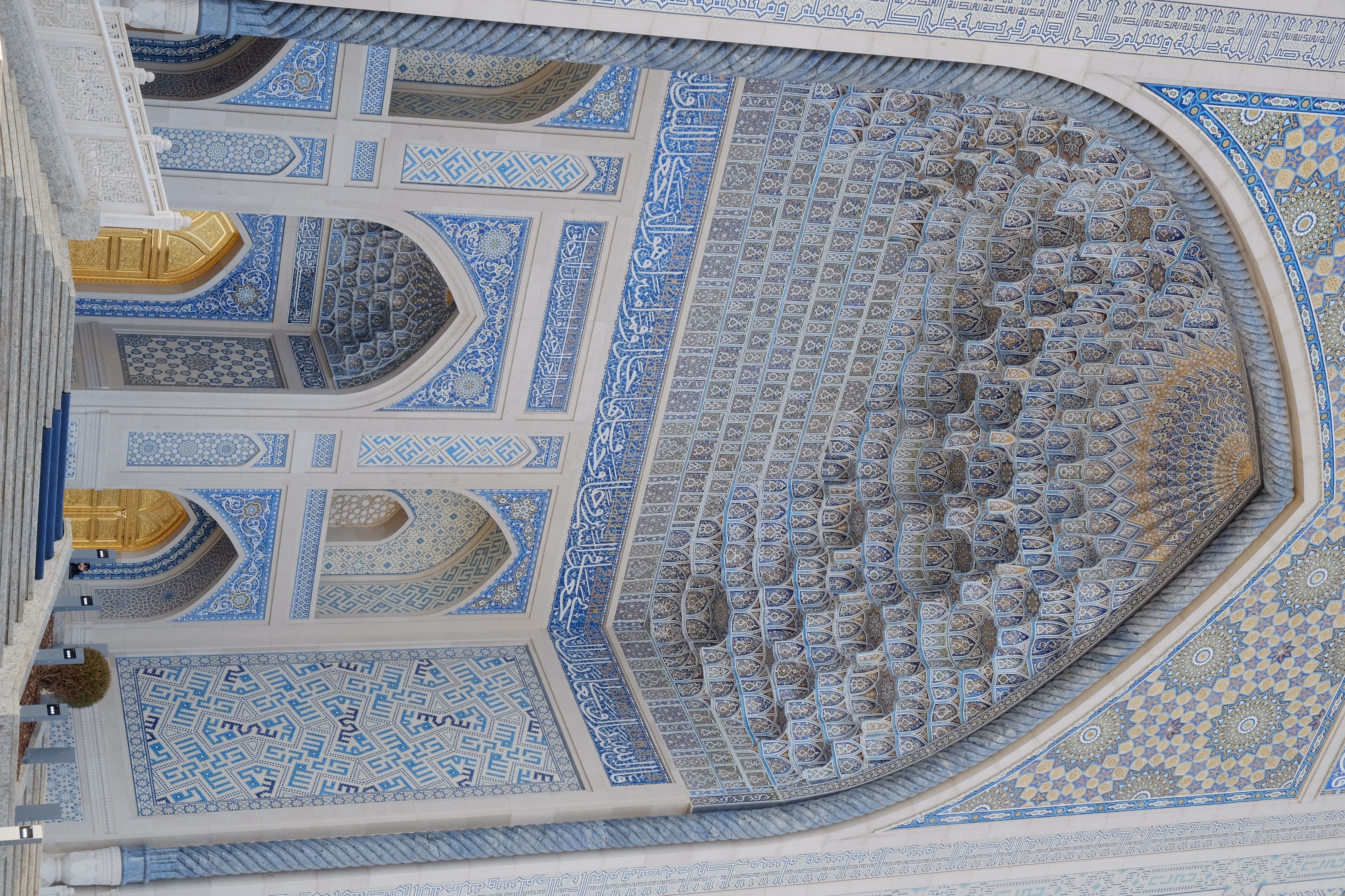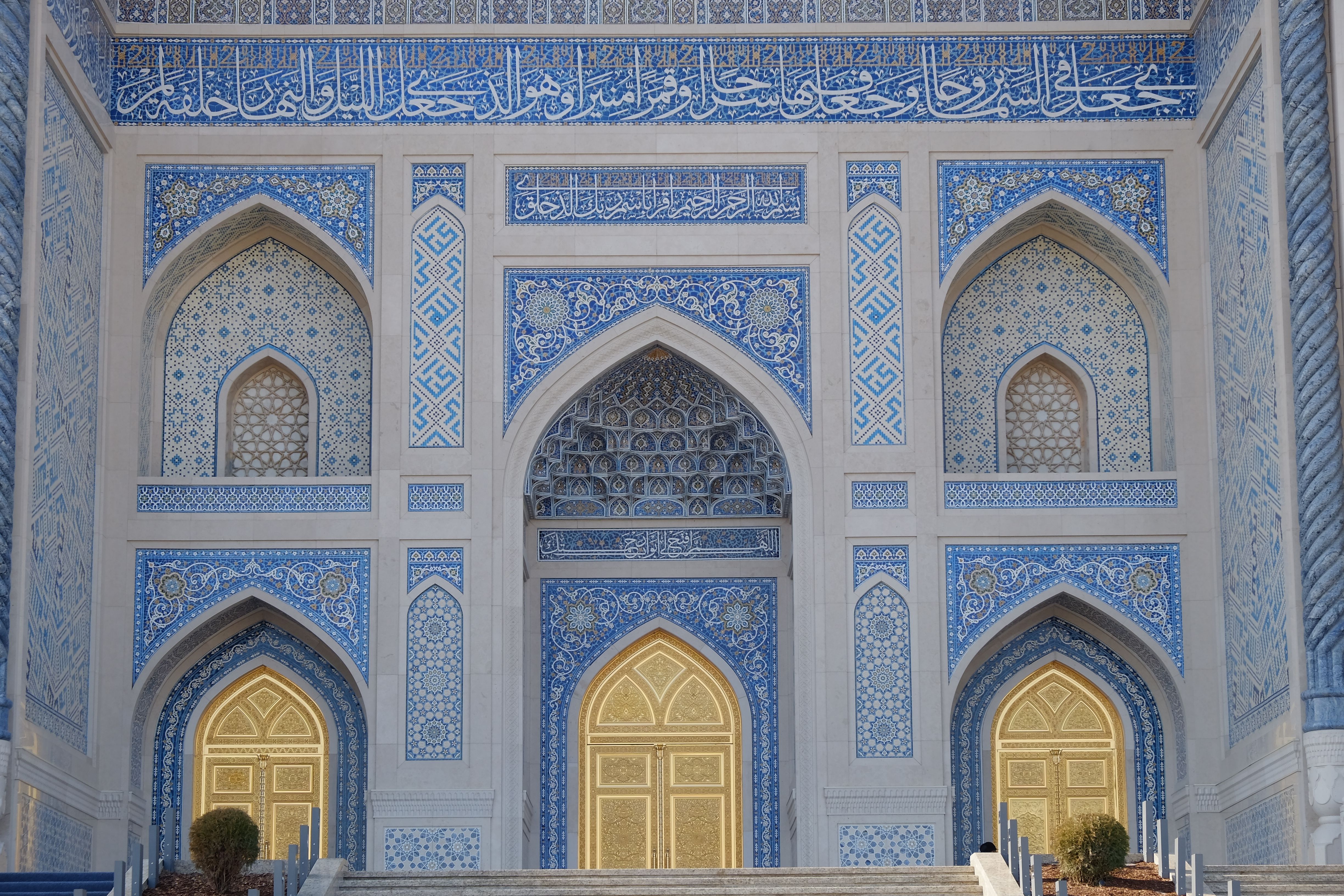 塔什干的世界伊斯兰文化中心四面均建有精美的Iwan,中央为巨大的穹顶(可惜不开放无法欣赏内部),尤以北面的Iwan最为精美(图1-4),可以看到其内部所开三扇门又嵌套了小型的Iwan。