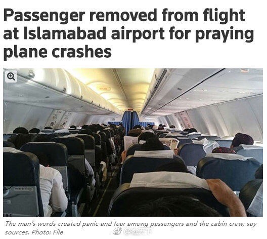 【佛系恐怖袭击】巴基斯坦媒体Geo TV 7日报道,一男子在伊斯兰堡国际机场登机,计划经迪拜飞往澳大利亚。男子在坐到自己的位置上后便开始祷告,希望飞机坠毁。其言语引起了其他乘客和机组成员的不安。最终,男子被安全人员带离飞机。