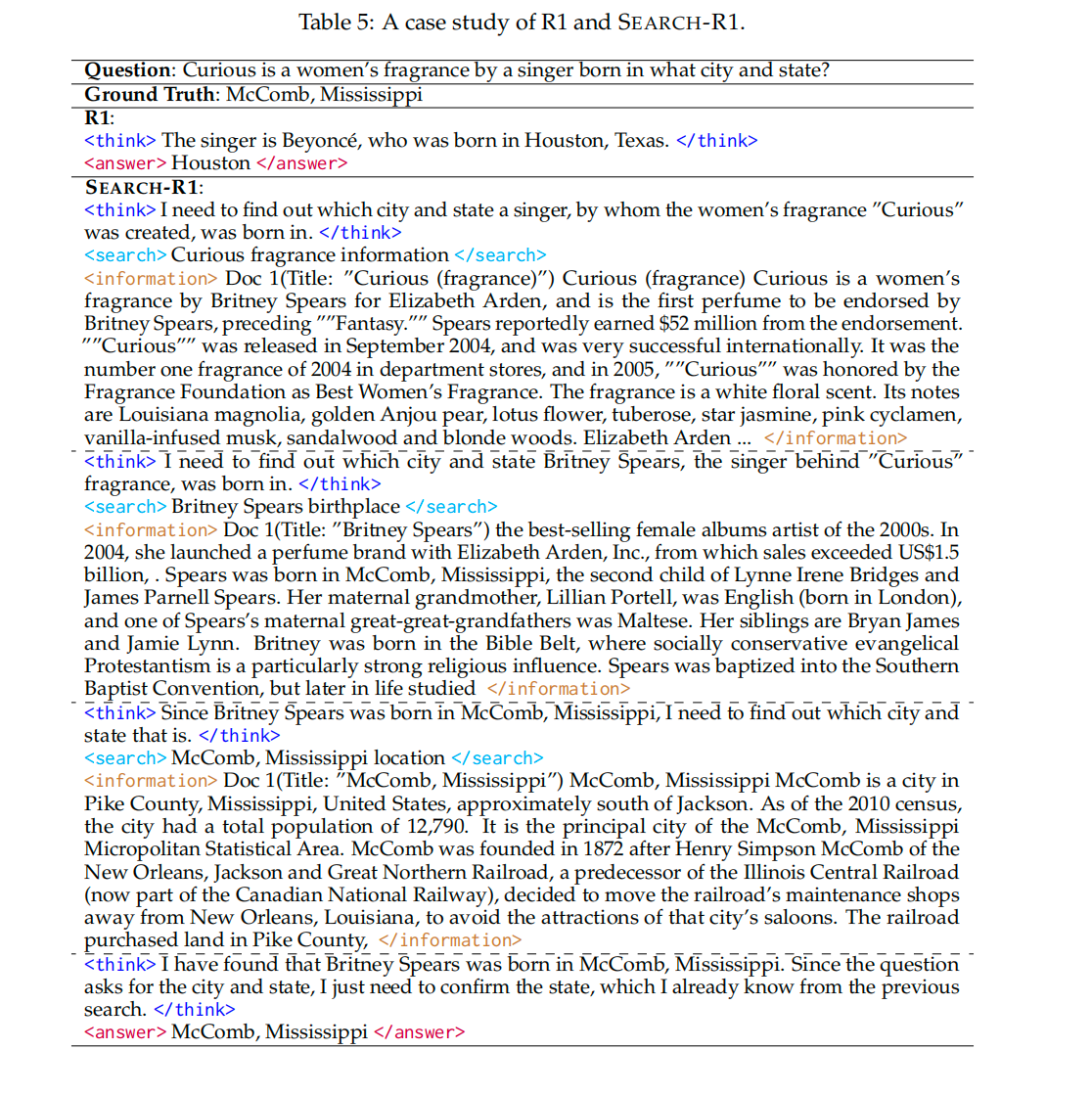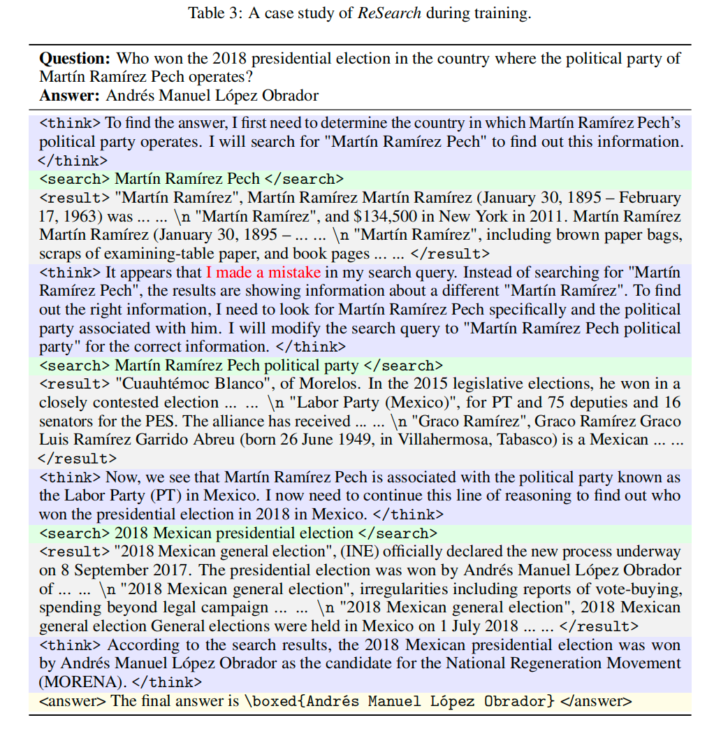 论文里放的case(图4、图5)挺有意思,仅通过RL + rule-based output reward(EM、F1等指标),LLM就学会了拆解问题、反思、自我纠正;并且要注意到,它们用的都是llama3、Qwen2.5系列模型,没用reasoning model;