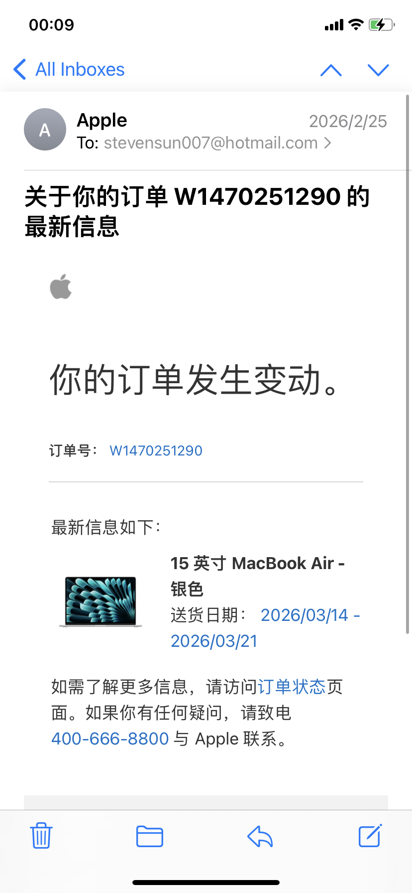 我2月初下单的 Macbook Air