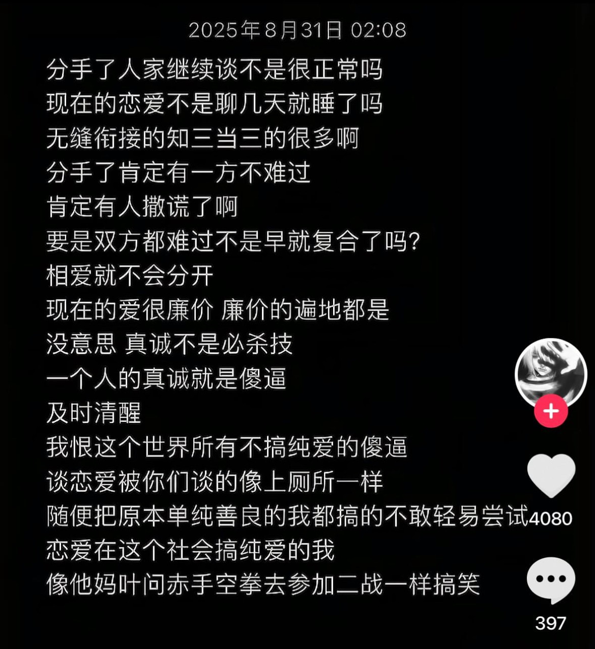 突然觉得没劲了,想戒烟戒酒,想把dating app注销掉,清理一下通讯录,把自己的能量往回收一收🥱有时间应该多运动多读书,和好朋友见面,常常联系家人,而不是做那些短暂填补空虚之后仍然让自己感到千疮百孔的事情