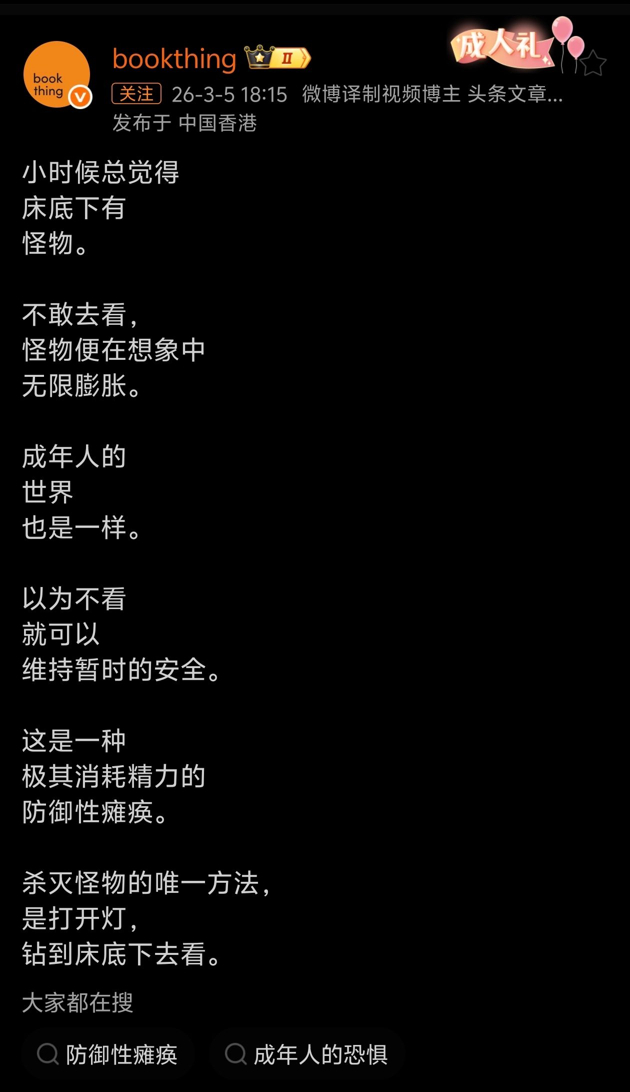 说到底,不只是天把人困住了,也是人把天缩小了。时间久了,人便慢慢认命,甚至开始觉得,待在井底也没什么不好。为什么一定要出去?外面也无非是另一口更大的井,于是连妥协也仿佛有了正当的理由。