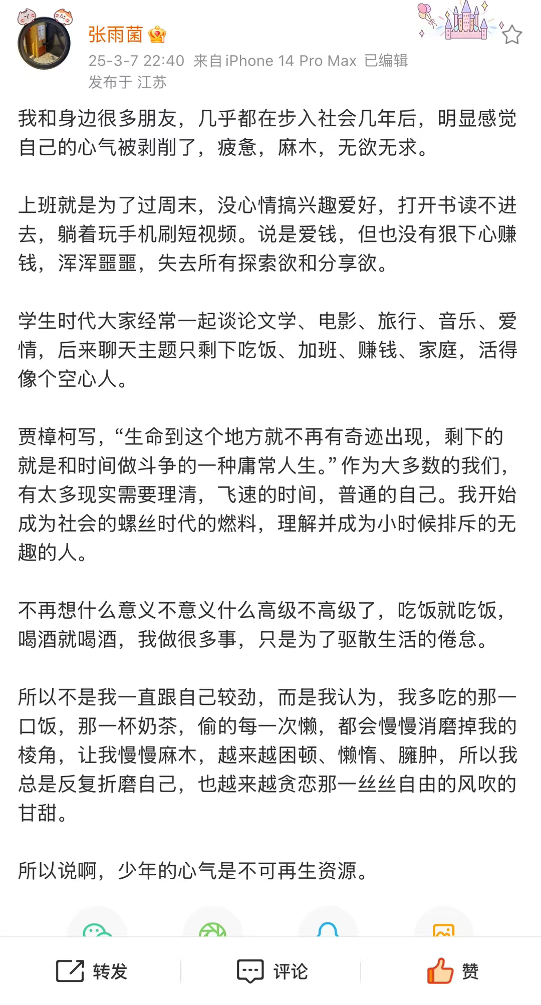 在这口井里,我们为了三瓜两枣拼命,偶尔掉下来一点糖,就足以让人暂且忘却长久的困苦与最初的梦想,仿佛那口糖,真的能中和掉经年累月的苦。可时间一久,糖的味道淡去,眼前的苦又重新浮上来,人也再次开始怜悯自己的命运。偏偏人总是好了伤疤忘了疼,只要生活再施舍一口糖,便又会心甘情愿地留在井里,仰头期待下一次掉落。