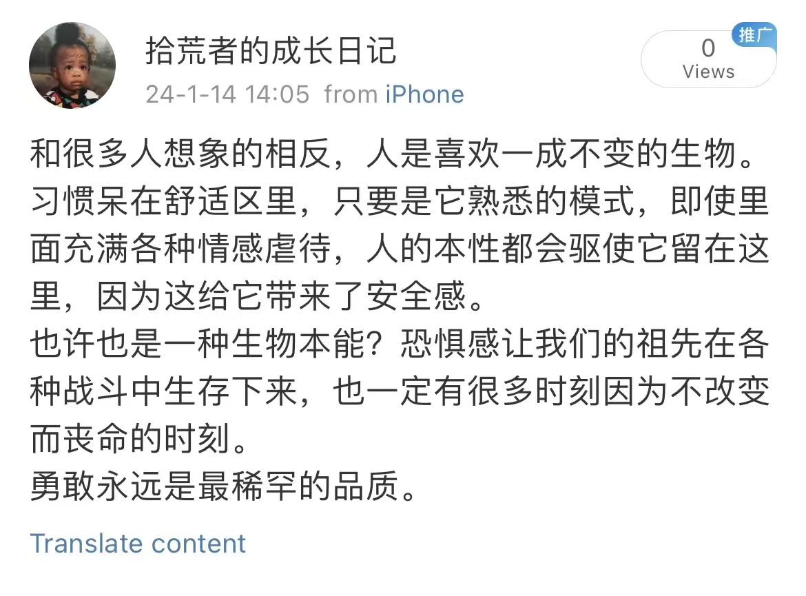 可笑的是,这口井很多时候是自己主动跳进去的。我们明知道它是井,也知道外面还有一片更大的天,却总能为留下找到理由。告诉自己这只是暂时的,告诉自己迟早会跳出去。可日子一天天过去,每一天都有新的借口,每一天也都在把暂时过成长久。到最后,这片井口上的天,也就成了唯一能看见的天。