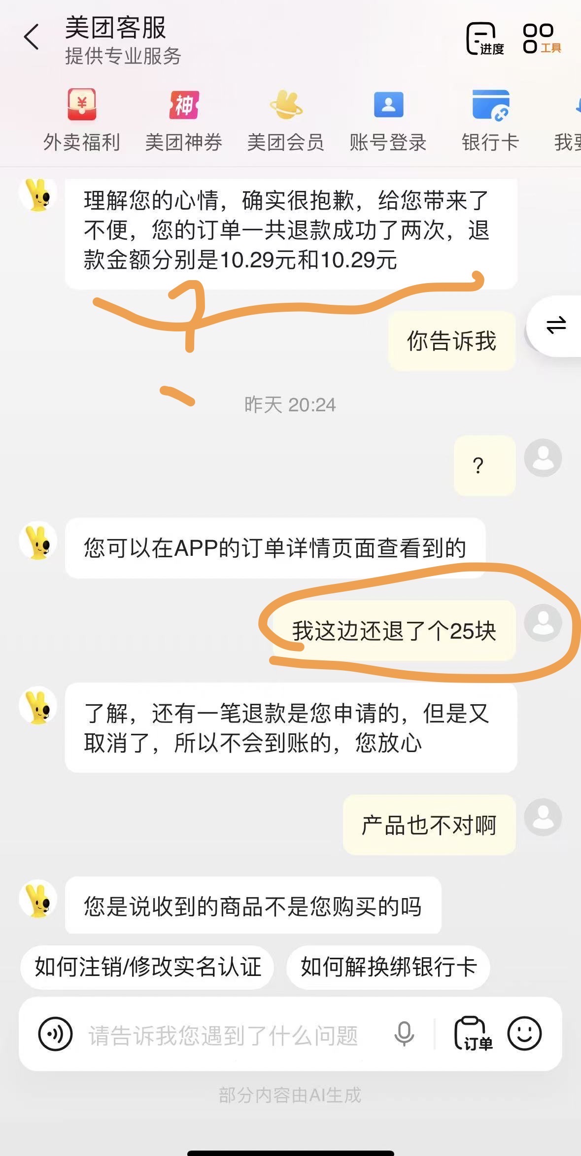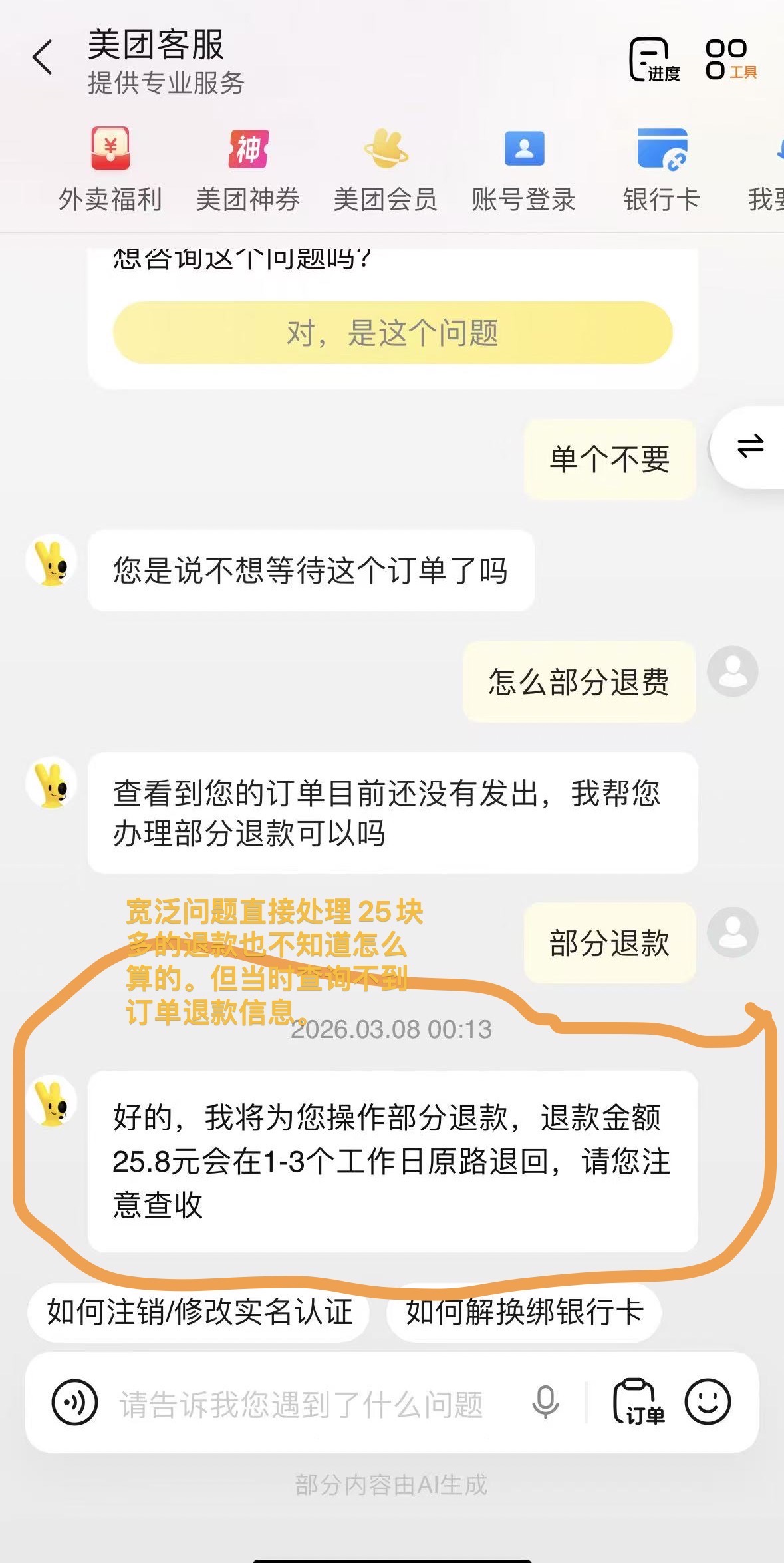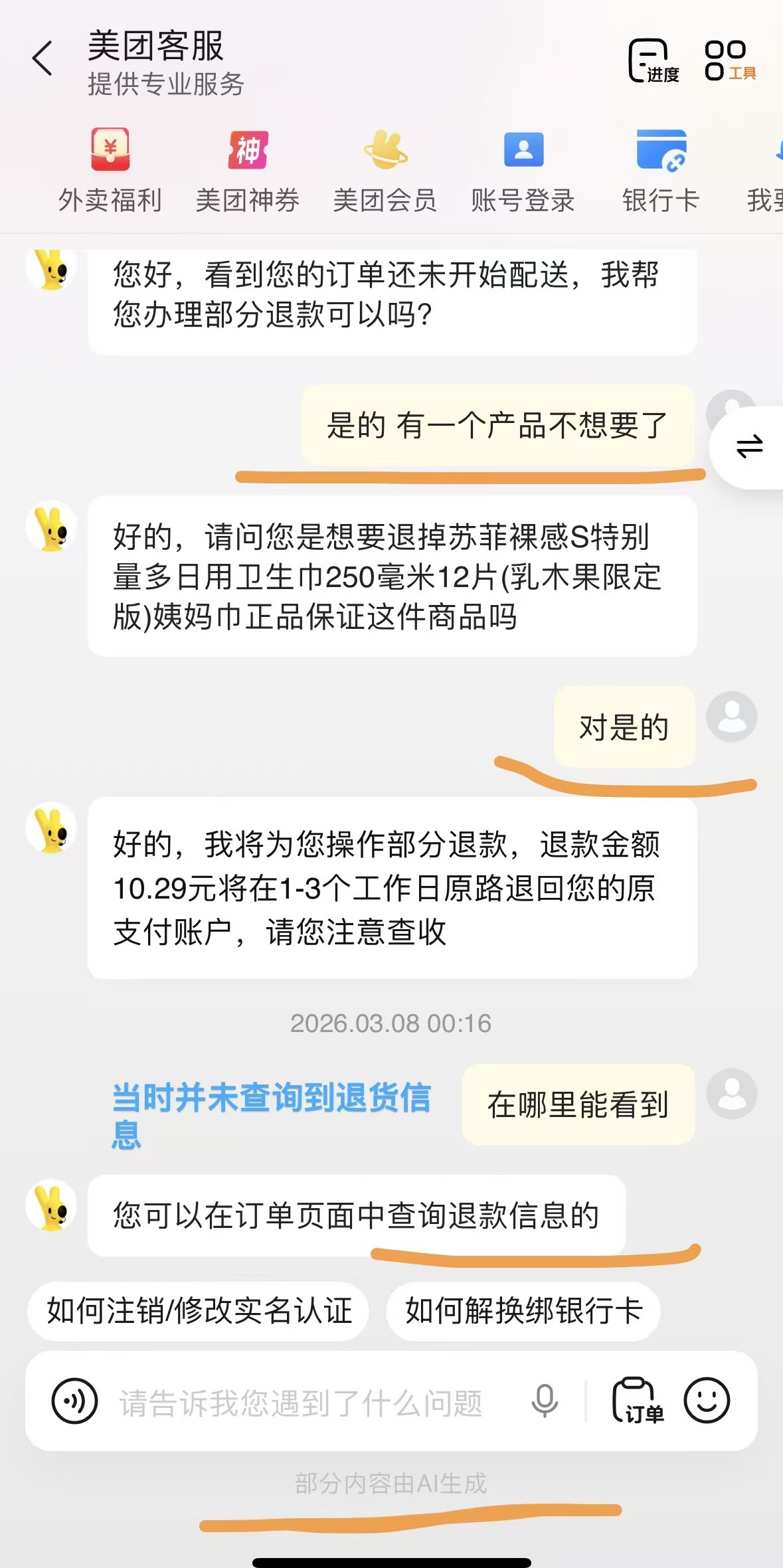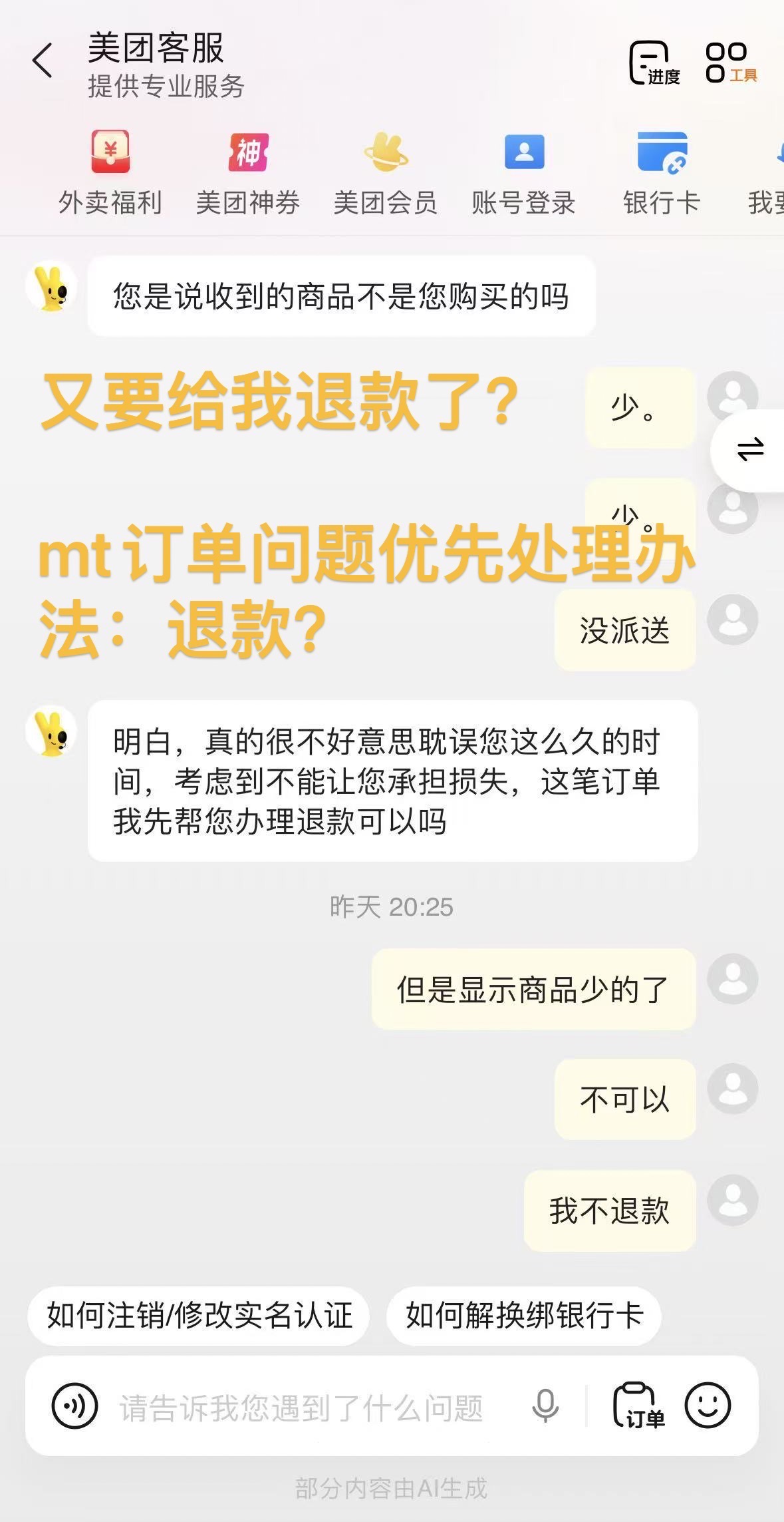 美团app 客服功能 未明显标注AI(仅在页面最下方标注部分内容由AI生成)用户不知道是智能(AI)客服还是人工客服。
