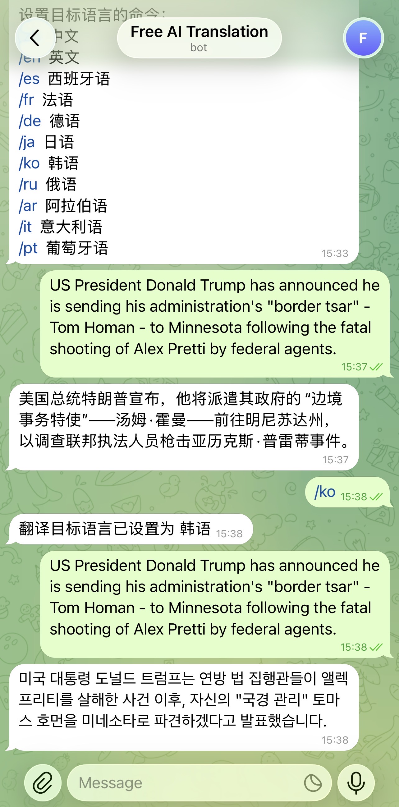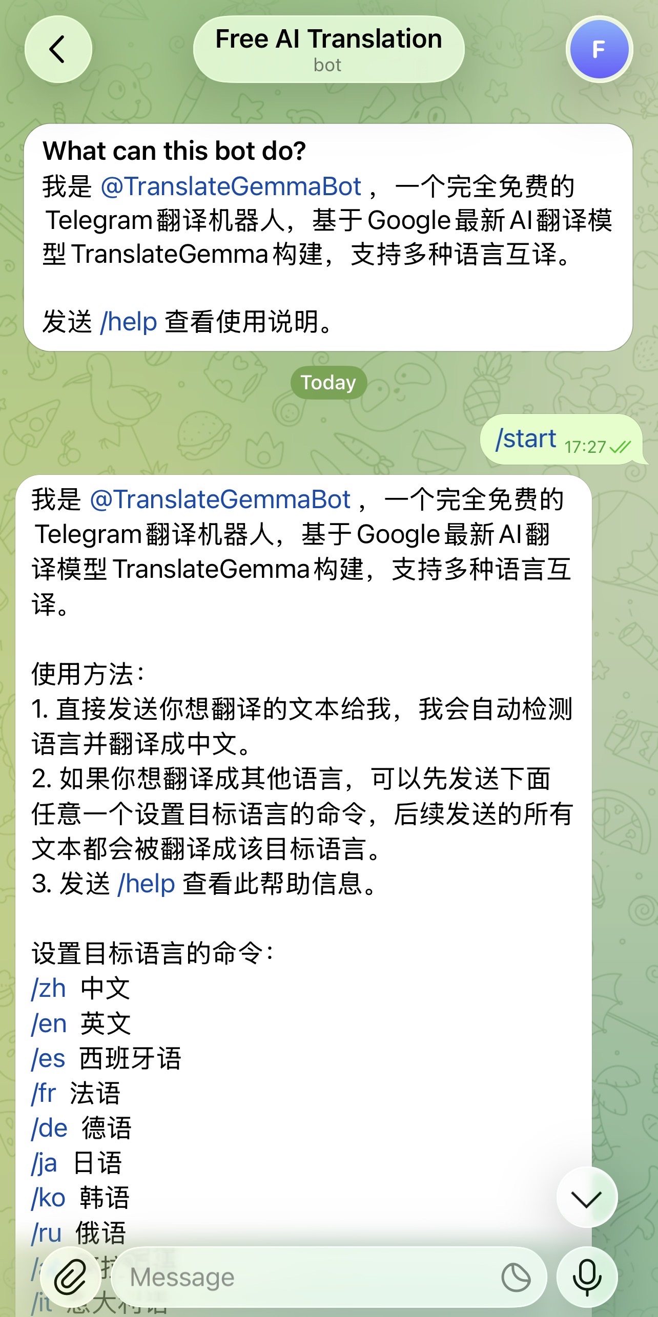 或者直接在Telegram里给 @TranslateGemmaBot 发消息