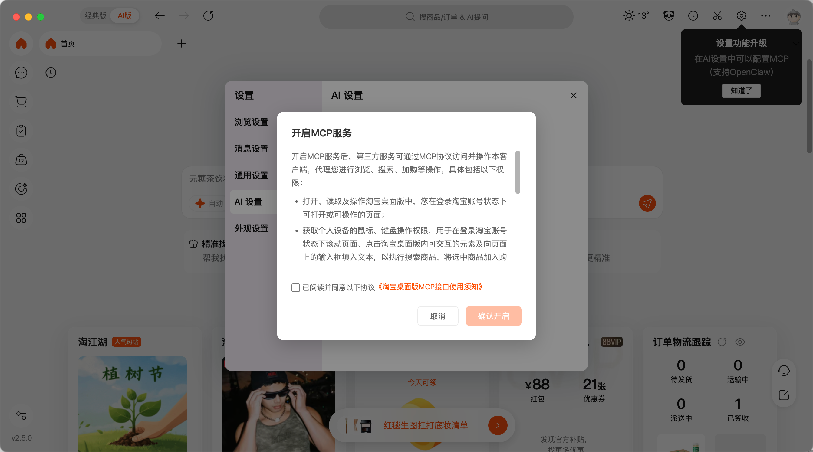 配图:淘宝 PC 版支持配置 MCP 操作客户端。