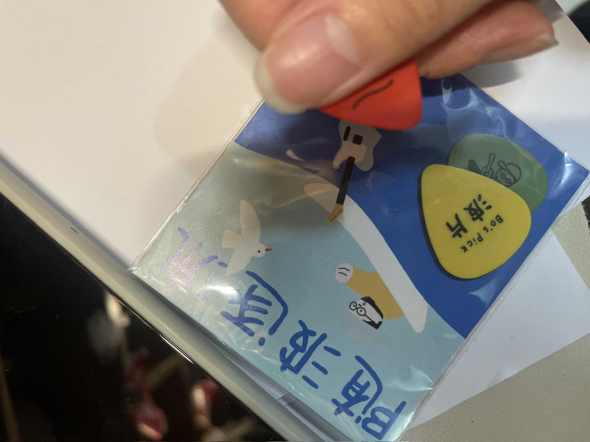这两天练音阶开始用用拨片,之前买的国足周边派上用场了。用拨片弹奏和用手指还是不太一样的感觉,但都得慢慢习惯