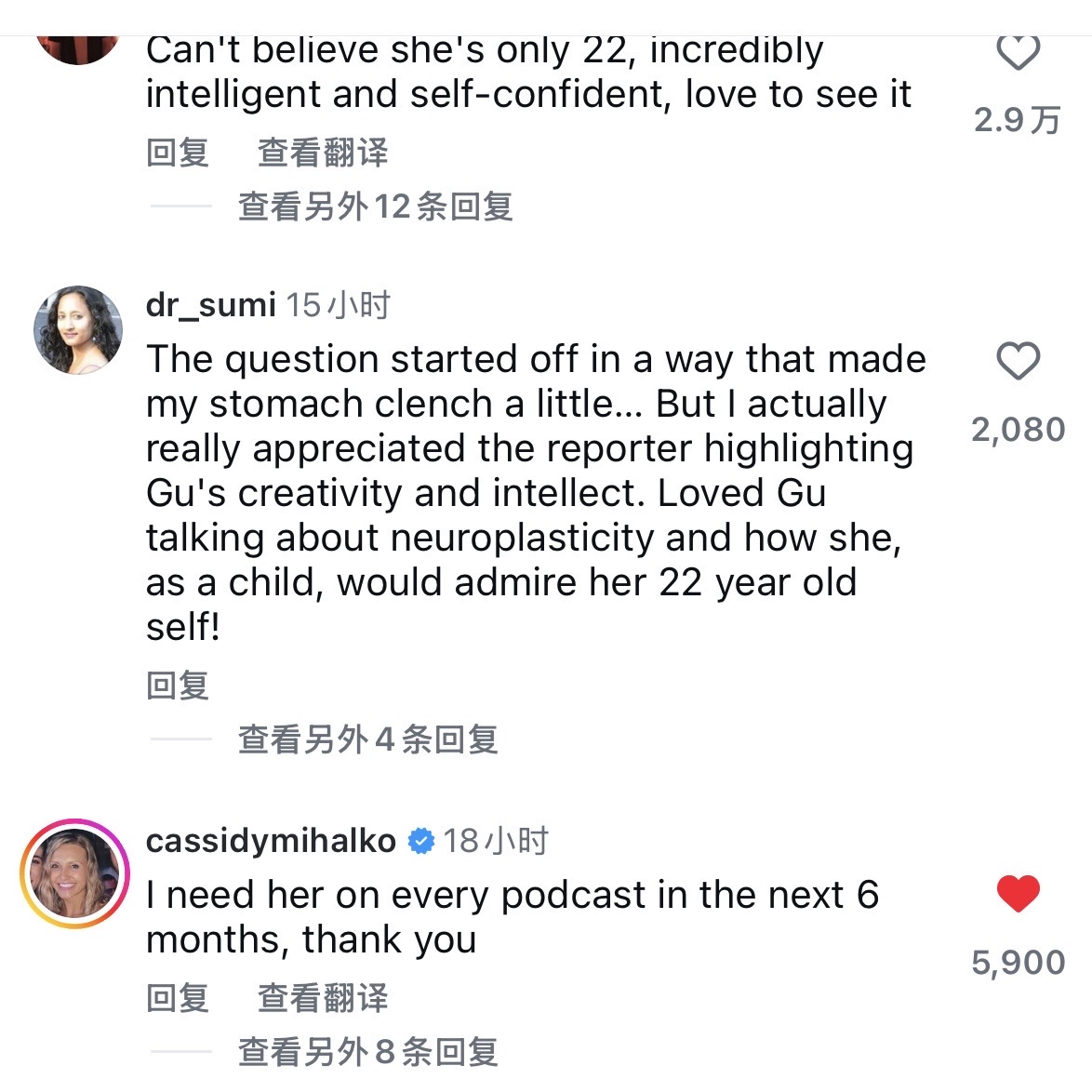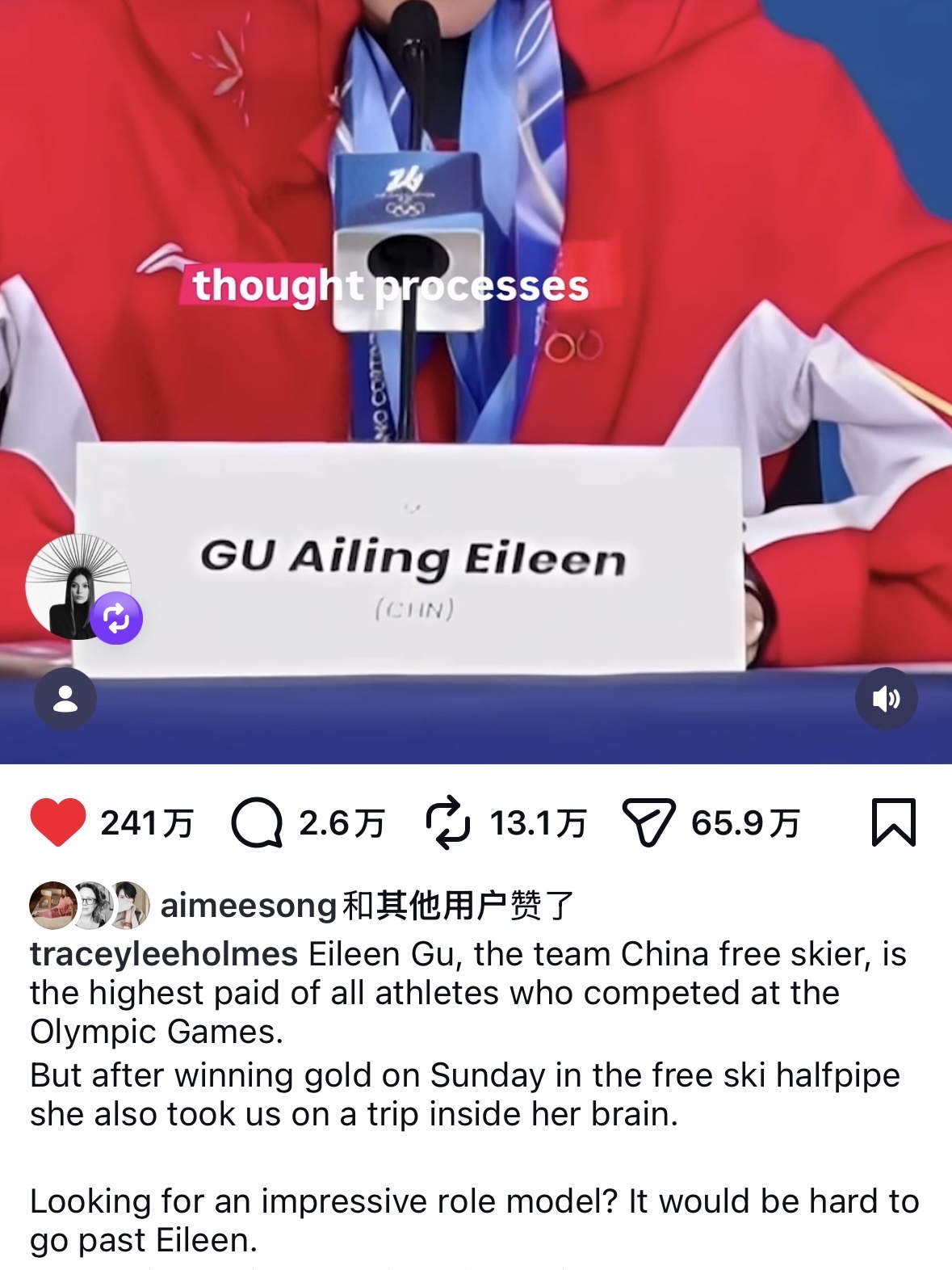 也很期待谷爱凌做客中文播客节目 「 I need her on every podcast in the next 6 months, thank you」