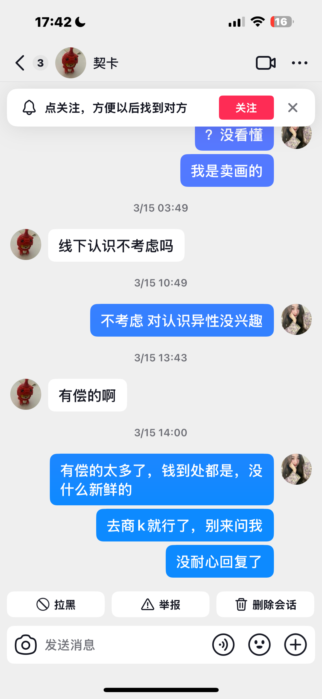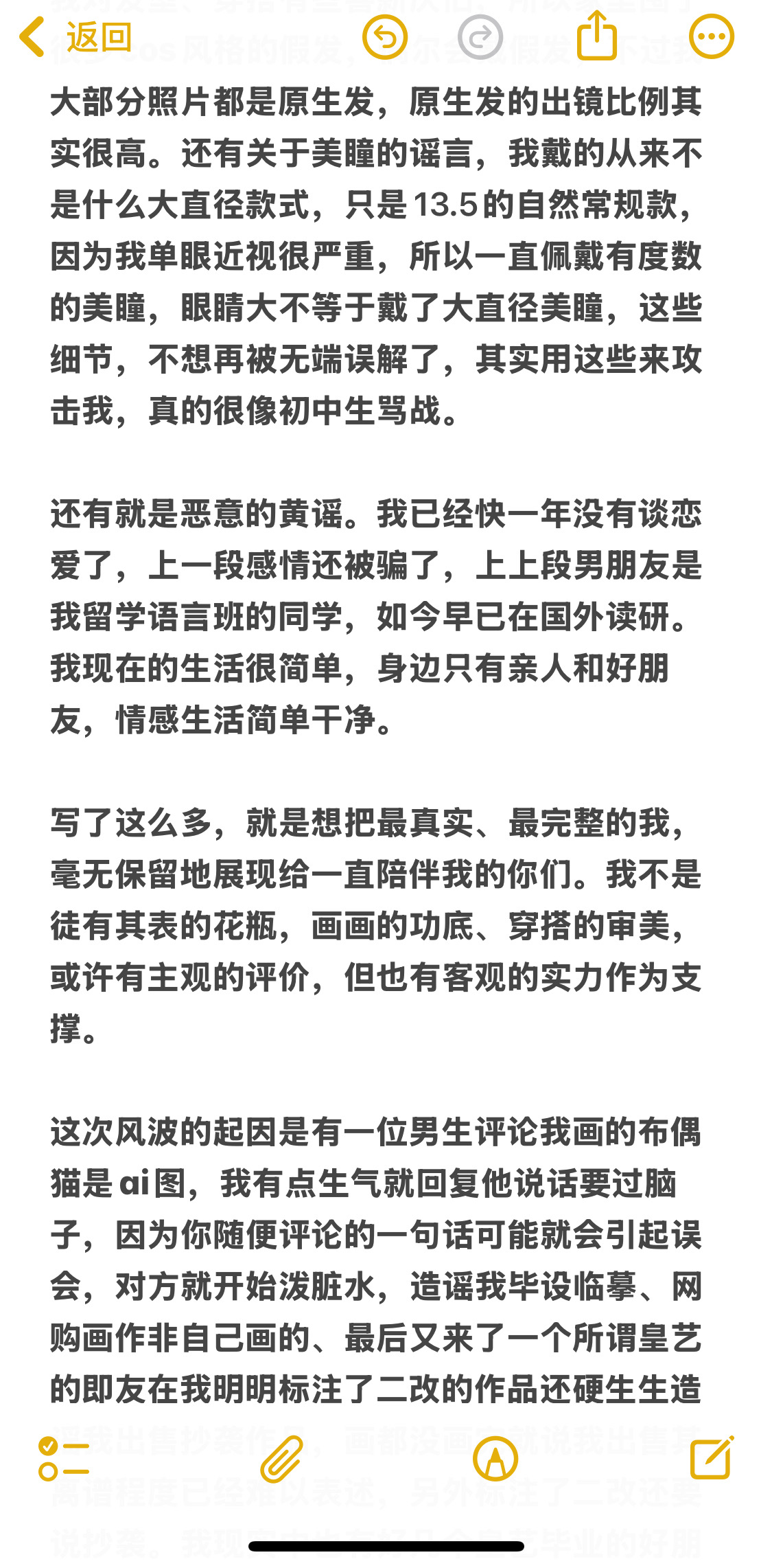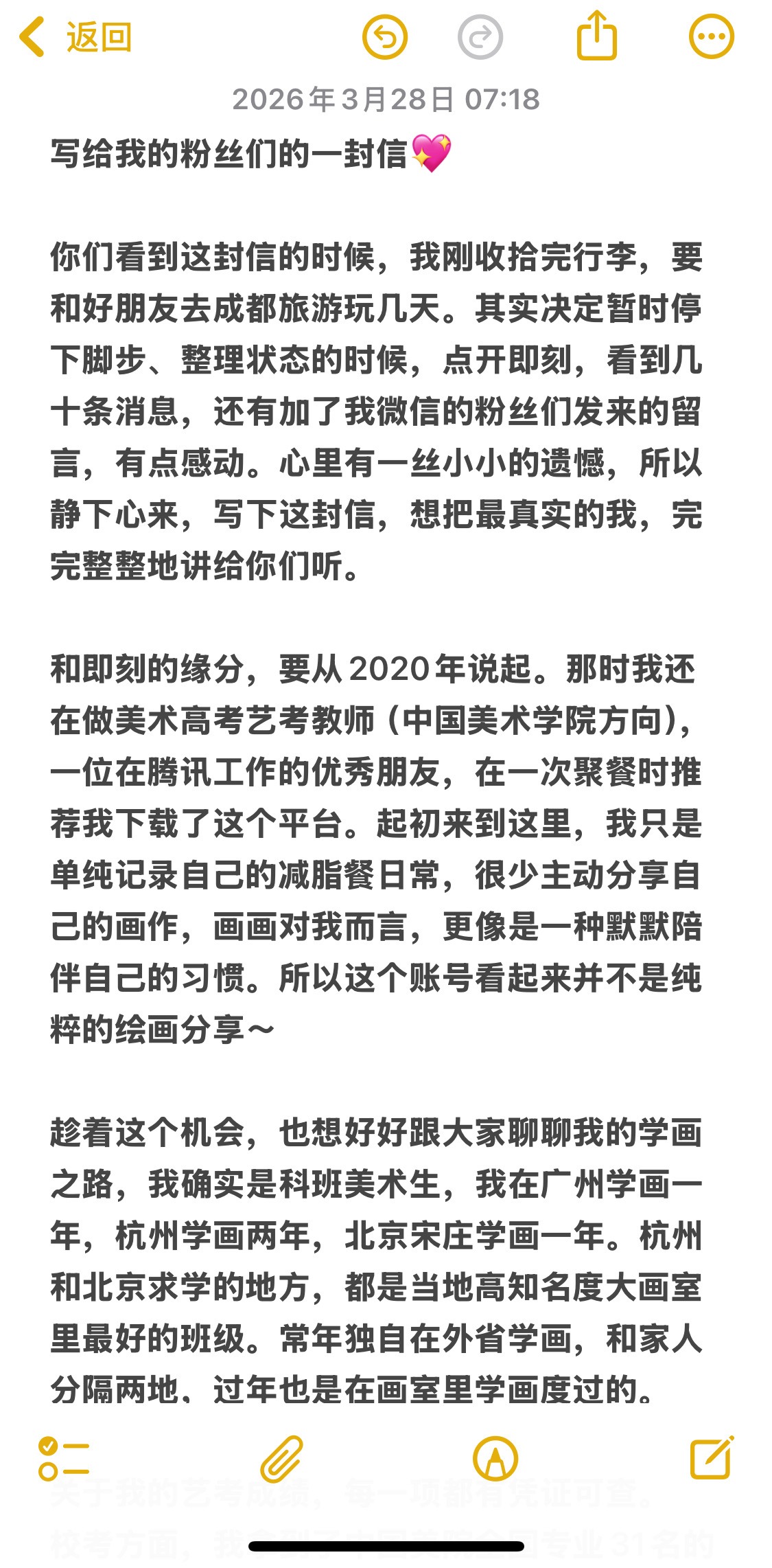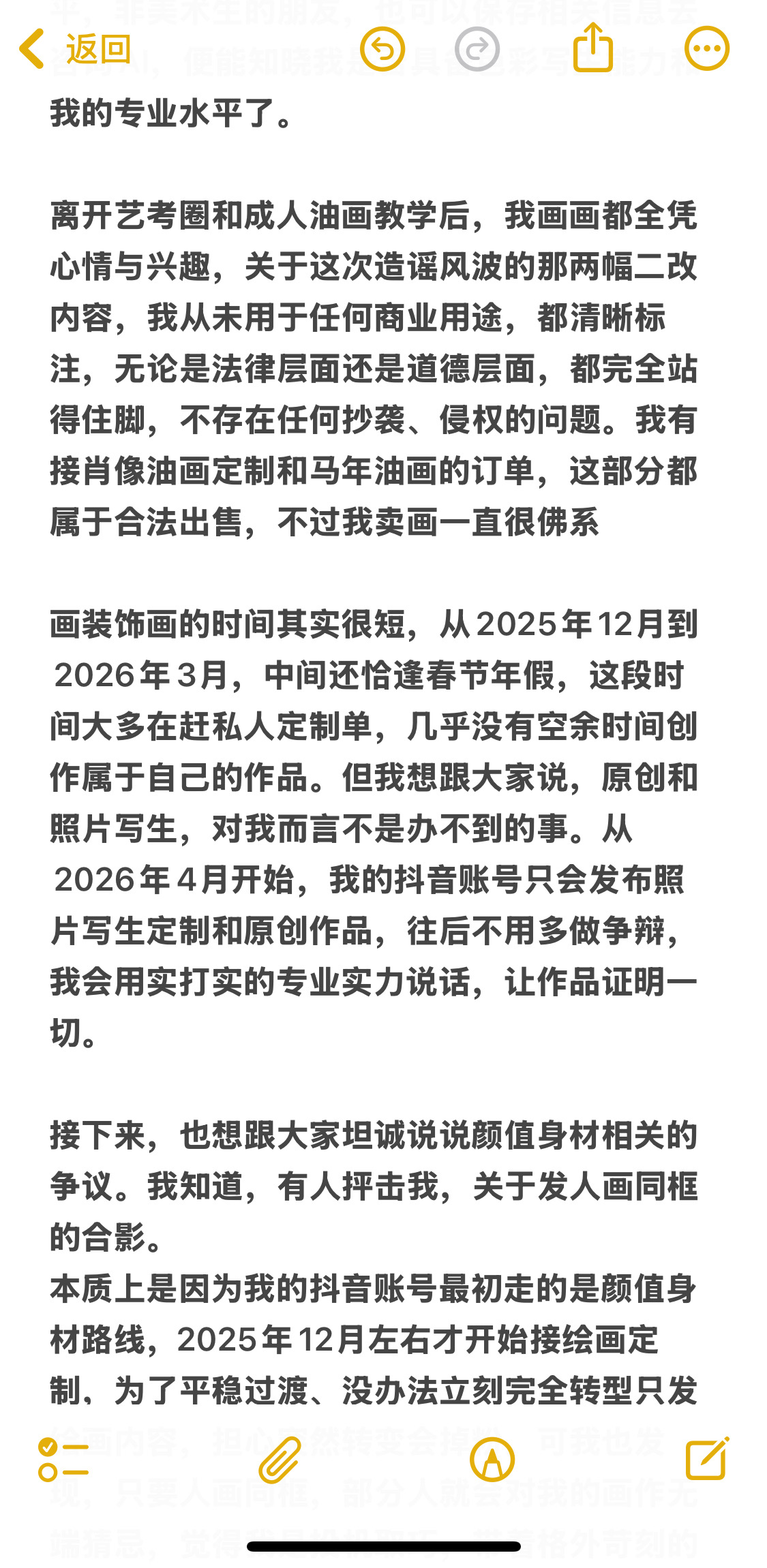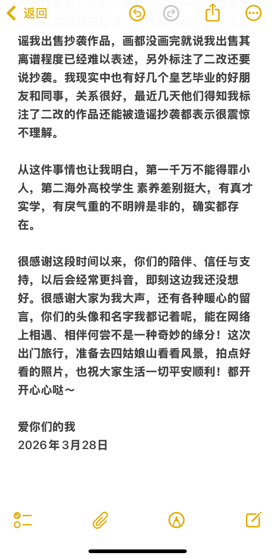 大家好,我决定不玩这个平台了,但证据会保留在这里。清者自清,我问心无愧,决定不用是因为我不想陷入自证了。以前把即刻当自己的小树洞发,记录生活和画。被造谣,我要反复澄清我觉得很累,造谣的人还要说你告我呀,更累了。有一个粉丝说:“造谣一张嘴,辟谣跑断腿”真的很有道理。有些人脑子突然一上头,没有理性看待问题,还要用词汇人身攻击你,我如果回骂我就要被拉到一个层次。我选择不回骂不反驳,事实大于雄辩,也感谢大家一直陪伴我,前段时间送画我也寄出去了,即刻这个树洞就关闭吧。我很累,我本来也是i 人,典型的intj ,我不喜欢解释,造谣者回头冷静下来可以重新看一遍整个事实。我也不期待每个人都具备理性、客观、公正的原则,做好自己,我无愧于每一个原创作者,也无愧于我自己,别说我不热爱画画了,我爱画画爱到骨子里,画画几乎是我人生的全部。没看到别人的来时路,就不要去否认别人的13年。就这样吧。