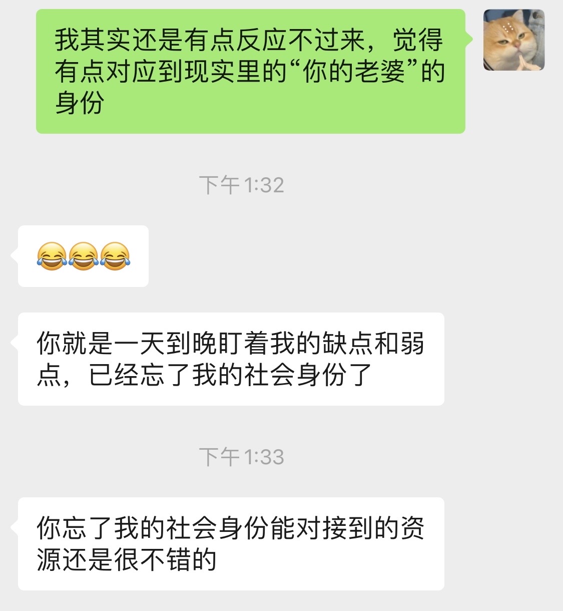 这个时候我老公抱怨说,你是不是忘记你老公的社会地位啦?你总是挑我的毛病,忘了我能链接到一些不错的社会资源。