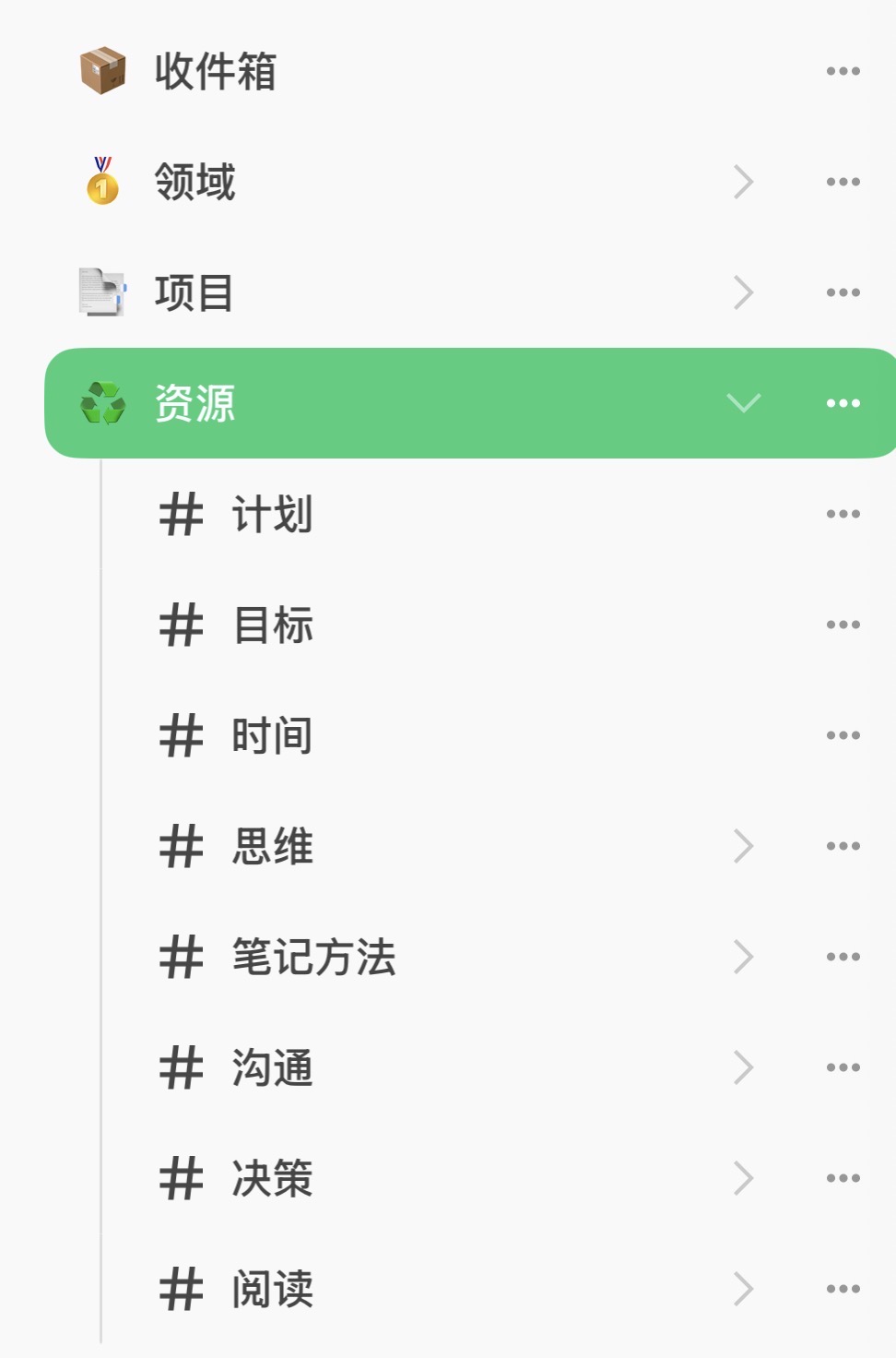 无论什么时候,我都会有当下需要精进领域,也会有一个又一个项目,还会有兴趣,以及各种临时性的笔记。所以,四大标签结构不会随着时间产生太大的变化。